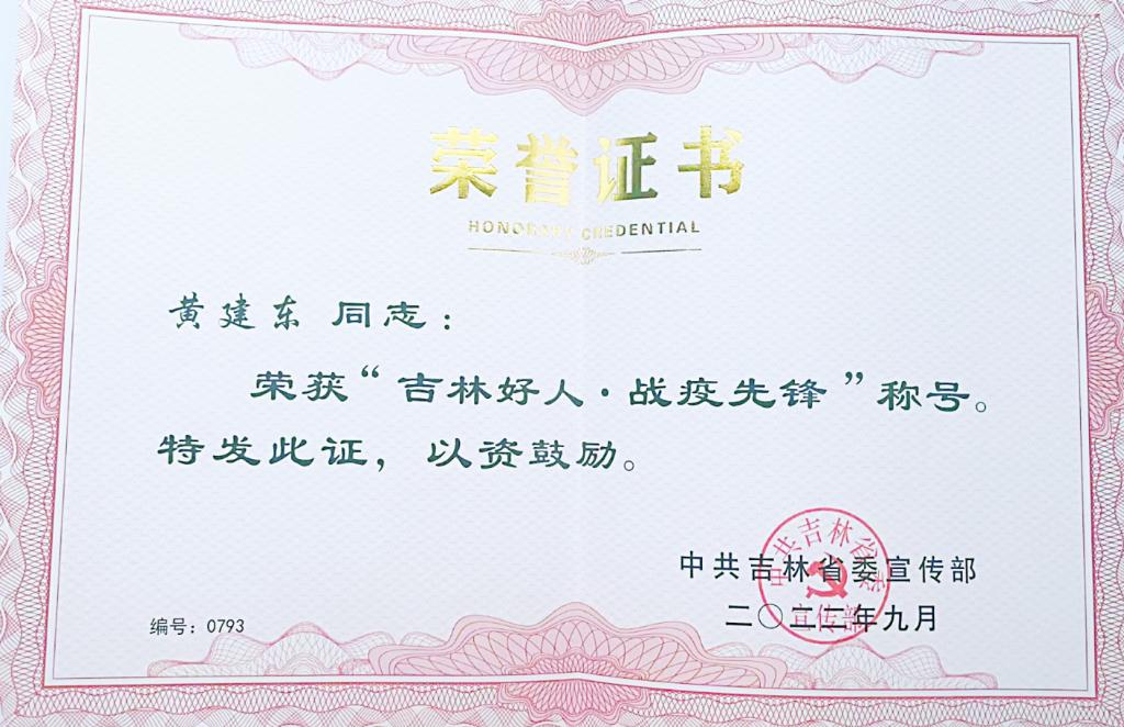 2023kaiyun官网黄建东荣获2022年第一、二季度“吉林好人”暨“吉林好人•战疫先锋”荣誉称号