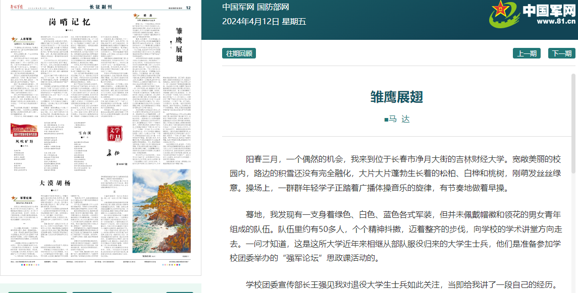 本网讯(校团委 供稿)4月12日,《解放军报》在《长征副刊》版面,发表马誉炜少将文章《雏鹰展翅》,报道了kaiyun官网习近平强军思想大学生理论学习小组事迹。该文章是由3月份来kaiyun官网为习近平强军思想大学生理论学习小组做雷锋精神宣讲的原中国人民解放军北京军区政治部副主任、军区善后办副政委,马誉炜(笔名马达)撰写。文章以故事体的形式,展示了kaiyun官网退伍大学生“退伍不褪色”的精神风貌。文章的结尾部分,马将军写到“在吉林财经...