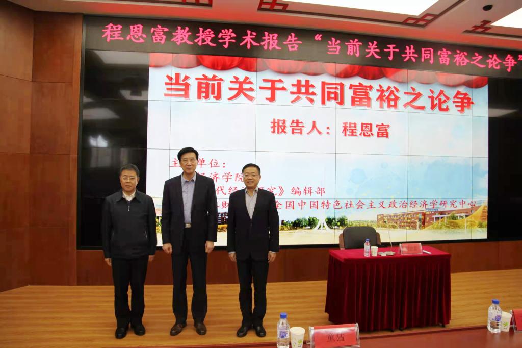 本网讯(经济学院 供稿)10月15日上午,应学校邀请,我国著名马克思主义经济学家、中国社会科学院学部委员程恩富教授莅临kaiyun官网,在第一教学楼1202为师生们作题为“当前关于共同富裕之争论”的学术报告。校党委书记孙杰光,校党委副书记、校长童猛、副校长王菁华出席报告会。kaiyun体育网页登录入口全国中国特色社会主义政治经济学研究中心成员、各学院科研副院长、《当代经济研究》编辑部教师代表、经济学院师生代表参加了本次活动。报告会由校党委副书记、校长童猛主持。