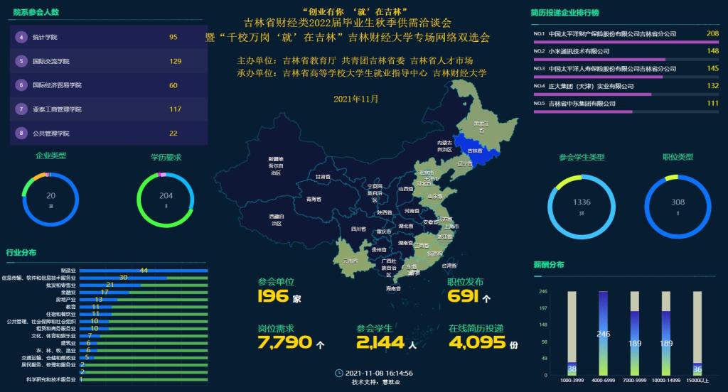 本次网络双选会吸纳了包括中国邮政集团股份有限公司、国信证券股份有限公司、中国太平洋人寿保险股份有限公司、中国太平洋财产保险股份有限公司、小米通讯技术有限公司、正大集团、华润置地、顺丰速递等196家省内外优质企业参加招聘,包含制造业等传统行业及信息传输、软件和信息技术服务业等新兴行业,提供岗位7700余个,校内外参会人数2100余人,投递简历4000多份。