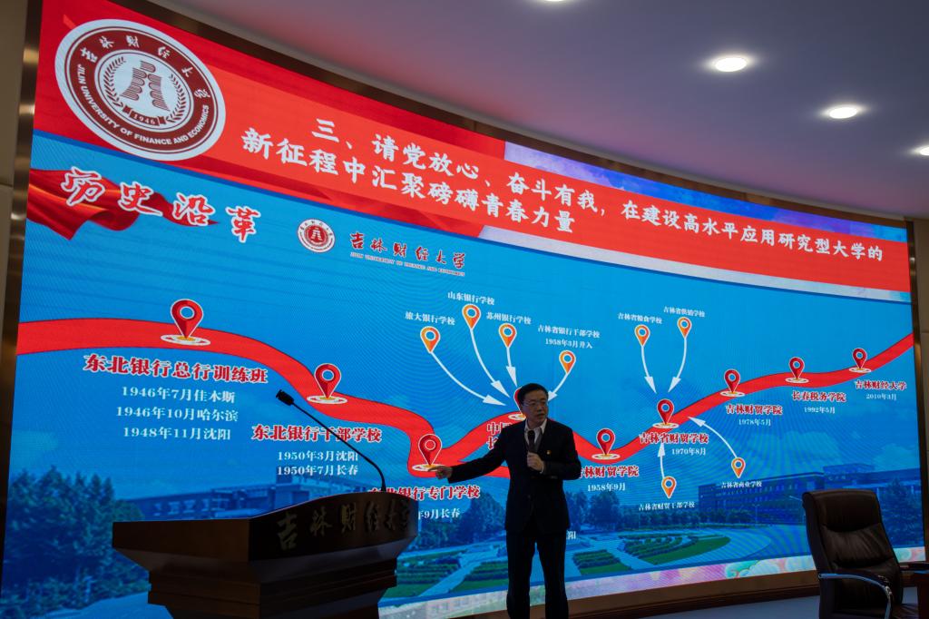 随后,校党委书记孙杰光以《认真学习贯彻党的十九届六中全会精神 弘扬伟大的建党精神 培养造就新时代财经英才》为题,从“请党放心、强国有我”、“请党放心、振兴有我”、“请党放心、奋斗有我”三个维度,以世情、国情、省情、党史党情、校史校情五个视角讲授了一堂精彩的思政课。首先,孙杰光带领全体青年师生深入学习了党的十九届六中全会精神。他说,这次全会是在我们党成立一百年的重要历史时刻,在党和人民胜利实现第一个百年奋斗目标、全面建成小康社会,正在向着全面建成社会主义现代化强国的第二个百年奋斗目标迈进的重大历史关头召开的。全会通过的《中共中央关于党的百年奋斗重大成就和历史经验的决议》是一篇马克思主义的纲领性文献,必将对推动全党统一思想、统一意志、统一行动,团结带领全国各族人民以史为鉴、开创未来,埋头苦干、勇毅前行,在新时代更好坚持和发展中国特色社会主义、实现中华民族伟大复兴产生重大而深远的影响。《中共中央关于党的百年奋斗重大成就和历史经验的决议》时间跨度长,涉及范围广,阐述了党的新民主主义革命时期、社会主义革命和建设时期、改革开放和社会主义现代化建设时期和新时代中国特色社会主义时期所取得的伟大成就,发生的历史性变革,全面总结了我们党百年奋斗五个方面的历史意义和10个方面的历史经验,特别是总结了其中的原创性思想、变革性实践、突破性进展和标志性成果,对成就梳理全面,对经验分析透彻,充分展示了马克思主义的强大生命力,增强了全党锚定既定目标,意气风发走向未来的勇气和力量。其次,在“请党放心、强国有我”第一个大问题中,孙杰光讲述了如何从“四个伟大成就”中,汲取砥砺前行的力量,如何从“五个庄严宣告”中,读懂中国全面小康的伟大光荣,如何从“伟大建党精神”中,体悟中国共产党人鲜明的政治品格,如何从“九个必须”中,解锁武装头脑、真抓实干的实践密码等四个方面问题,他强调指出,中国共产党建党求什么?坚持真理、坚守理想;中国共产党立党为什么?践行初心、担当使命;中国共产党兴党凭什么?不怕牺牲、英勇斗争;中国共产党强党靠什么?对党忠诚、不负人民;再次,在“请党放心、振兴有我”第二个大问题中,孙杰光从历史维度回顾了东北发展历程,强调要深刻领会习近平总书记关于东北全面振兴的殷切期望和目标定位;从战略维度分析了东北全面振兴面临的机遇挑战,指出如何准确把握习近平总书记关于东北全面振兴的重大判断;强调要从实践维度把握新发展阶段、贯彻新发展理念、构建新发展格局,推动高质量发展,确保实现习近平总书记提出的东北振兴“十四五”时期要有突破、要有战略性举措的目标。他强调指出,东北振兴面临“习近平总书记亲自擘画新时代东北全面振兴的战略性机遇”、“党中央全力支持东北振兴的政策性机遇”、“深化东北亚经济合作、扩大开放的机遇”、“新一轮科技革命带来的创新机遇”等四大机遇,具有“制造业优势,商品粮基地优势,沿边近海优势,生态环境优势,科教人文优势”等五大优势。为贯彻落实习近平总书记 “构建优势互补高质量发展的区域经济布局”“加快推进长吉一体化发展,培育发展现代化都市圈”的总体要求,吉林省委制定了“一主六双”高质量发展战略,力争要在“构建优势互补高质量发展的区域经济布局、培育长春都市圈城市群”、“构建多点支撑、多业并举、多元发展的产业发展新格局”、“新基建‘761’工程、交通强省等‘两新一重’项目投资”、“推进‘数字吉林’建设、加快对老工业基地全方位全角度全链条数字化、智能化、网络化改造提升”、“深化创新驱动发展战略、推动转型升级、新旧动能转换”、“深化改革、优化营商环境、构建现代市场经济体制、”“扩大开放合作、融入国内国际双循环新发展格局、建设开放合作高地”等七个方面取得突破;最后,在“请党放心、奋斗有我”第三个大问题中,孙杰光从党的新民主主义革命时期、社会主义革命和建设时期、改革开放和社会主义现代化建设时期和新时代中国特色社会主义时期等四个历史时期、以学校的社会发展背景、师生社会实践、人才培养成效、服务社会经济发展等四个方面详细梳理了学校红色金融的发展历史和不同发展阶段的专业设置,他强调指出,kaiyun官网在75年的办学历程中,逐渐形成了“艰苦奋斗的创业精神、与时俱进的创新精神、奋斗不止的实干精神、攻坚克难的拼搏精神和甘于奉献的爱心精神”,并对青年师生饱含深情地提出了四点希望:一是坚定理想信念,厚植爱国情怀;二是加强品德修养,增长知识见识;三是培养奋斗精神,学会自找苦吃;四是增强综合素质,实现全面发展。孙杰光希望青年师生要立大志、明大德、成大才、担大任,大力弘扬伟大建党精神,勿忘昨天的苦难辉煌,无愧今天的使命担当,不负明天的伟大梦想,以史为鉴、开创未来,埋头苦干、勇毅前行,为实现第二个百年奋斗目标、实现中华民族伟大复兴的中国梦而不懈奋斗。