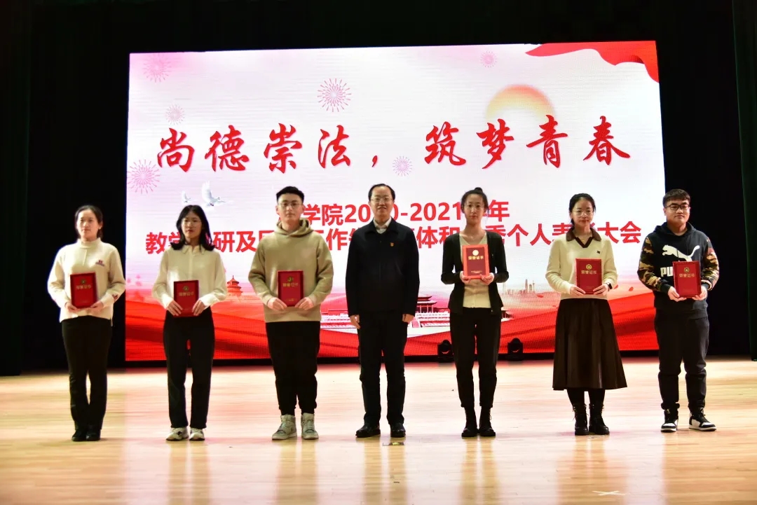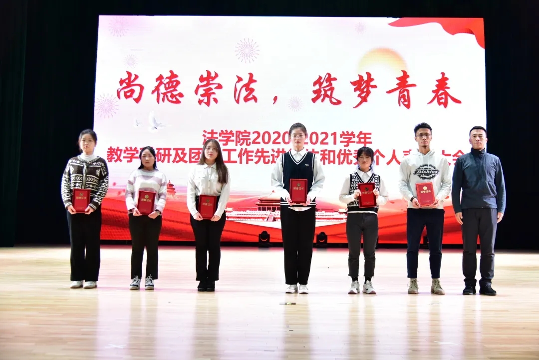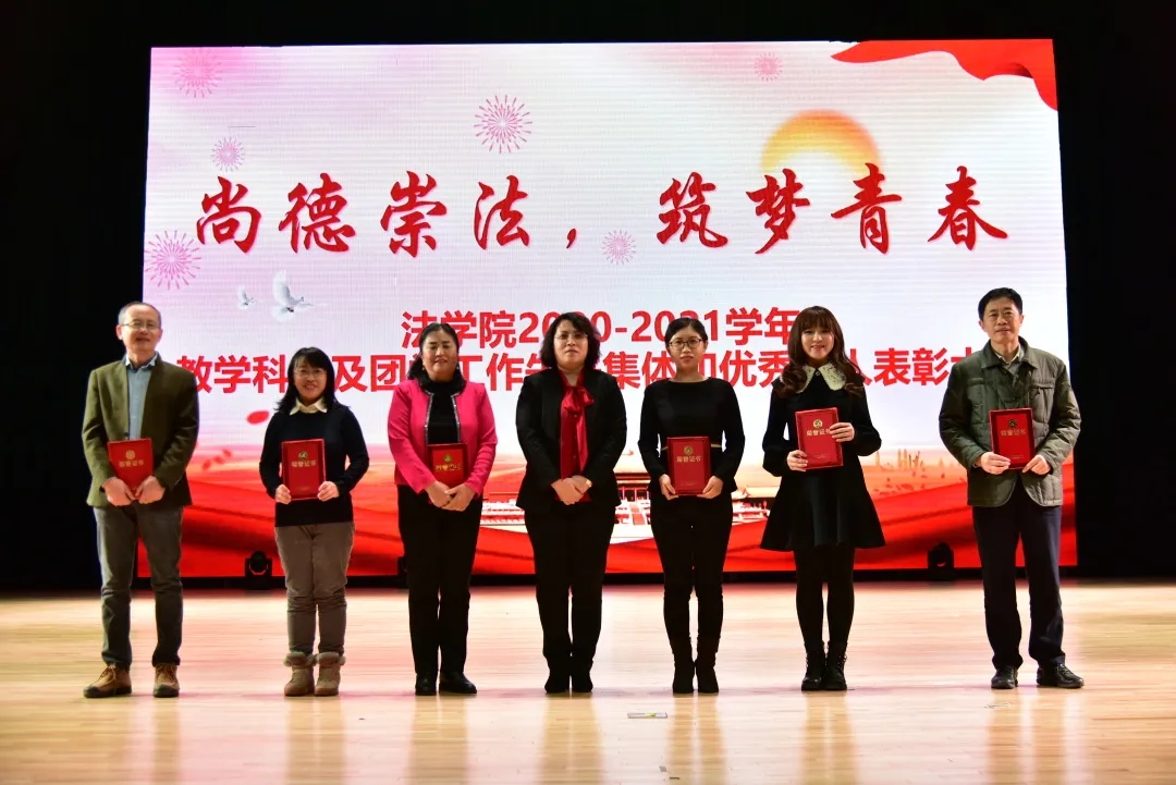 本网讯(法学院 供稿)2020—2021学年,法学院在校党委的正确领导下,在学院班子凝心聚力下,法学院全体师生勠力同心,认真贯彻党和国家的教育方针,全面推进工作创新,在教学、科研、学团工作等方面取得了喜人的成绩,涌现出了一批在学院发展中有突破性工作成果的先进集体和优秀个人。为表彰先进,树立典型,进一步激发教师的工作热情,激励广大同学寻找差距、迎头赶上,形成师生互动、教学相长的良好局面,12月1日,法学院于kaiyun体育网页登录入口多功能学术中心举办2020—2021学年“尚德崇法•筑梦青春”教学科研及团学工作先进集体和优秀个人表彰大会暨“爱国心向党•宪法伴我行”主题迎新晚会。