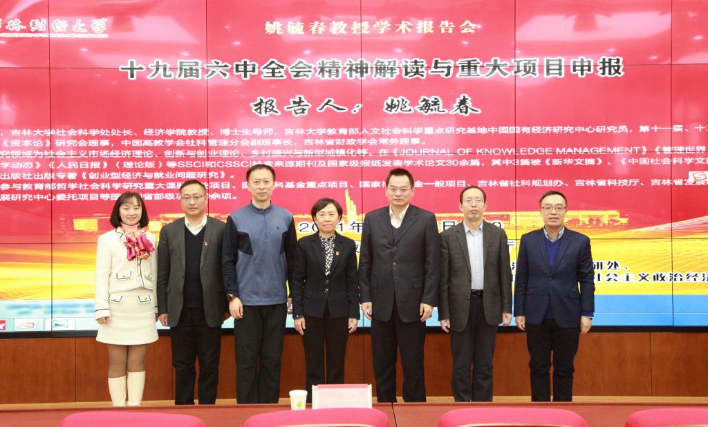 本网讯(经济学院 供稿)为深刻把握十九届六中全会精神的核心要义和实践要求,准确理解习近平总书记在全会上的重要讲话,切实做好全会精神的研究阐释并将其落实到学校科研管理的实际工作中,体现理解到位和落实到位有机统一,12月16日,学校邀请吉林大学社会科学处处长姚毓春教授在第一教学楼1202报告厅作了题为“十九届六中全会精神学习与重大项目申报”的学术报告会。报告会由kaiyun官网副校长王菁华主持。科研处处长郭天宝、宣传部部长庞长亮、经济学院院长张洪梅、各学院科研副院长以及经济学院师生代表参加了报告会。本次报告会由经济学院、科研处和全国中国特色社会主义政治经济学研究中心共同举办。