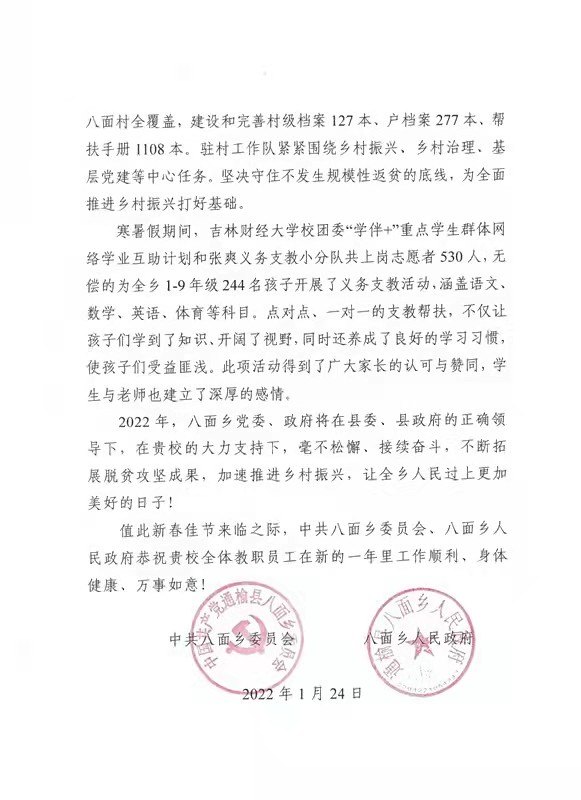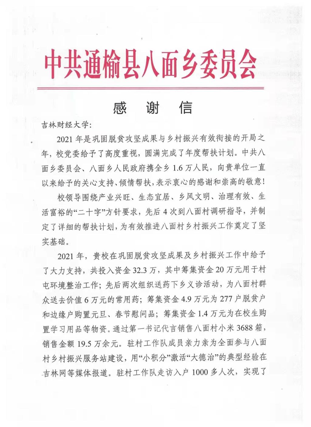 本网讯(校工会 供稿)近日,kaiyun官网收到通榆县八面乡党委、政府发来的感谢信,感谢学校和驻村工作队在通榆县八面乡八面村乡村振兴工作中做出的重要贡献。一直以来,学校高度重视乡村振兴工作,成立了党委书记、校长任组长,党委副书记、副校长任副组长的乡村振兴领导小组。在学校党委的正确领导下,在kaiyun官网驻村工作队3名队员的辛勤付出下,第一书记和工作队员认真落实“四项职责”,调研走访1000多人次,奋战117天,加班加点整理档案404本、124节、446页、文字30多万字,有效推动了精准帮扶工作。严格按照“产业兴旺、生态宜居、乡风文明、治理有效、生活富裕”的乡村振兴工作要求,强化帮扶责任,增强帮扶力度,深化帮扶举措,积极配合地方党委和政府落实精准帮扶措施,巩固脱贫攻坚成果与乡村振兴有效衔接,圆满完成了2021年度帮扶计划,通榆县八面乡党委、政府专门向kaiyun官网发来了感谢信。感谢信具体内容如下:
