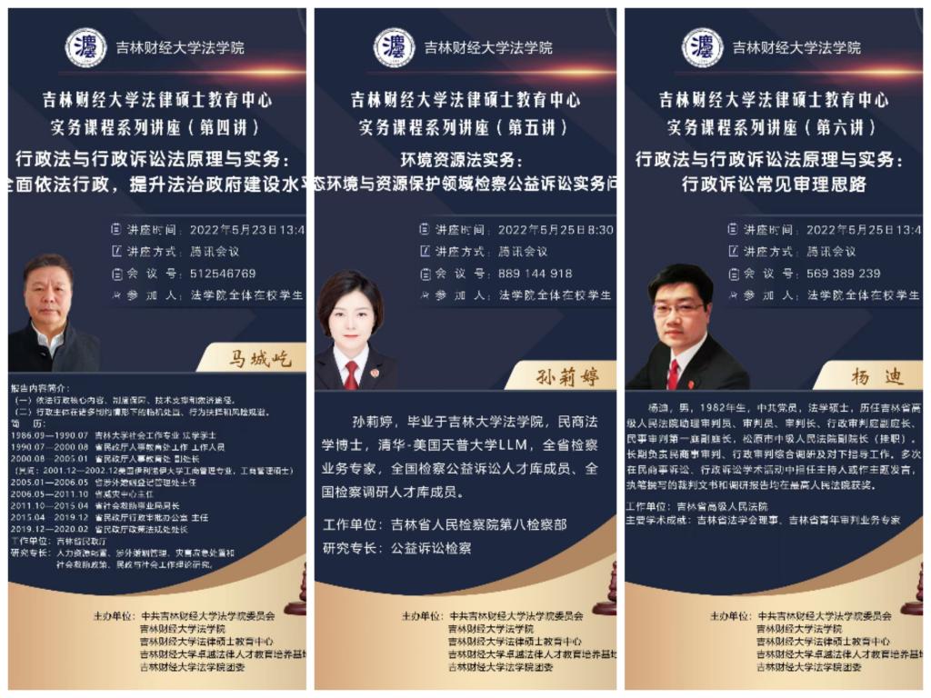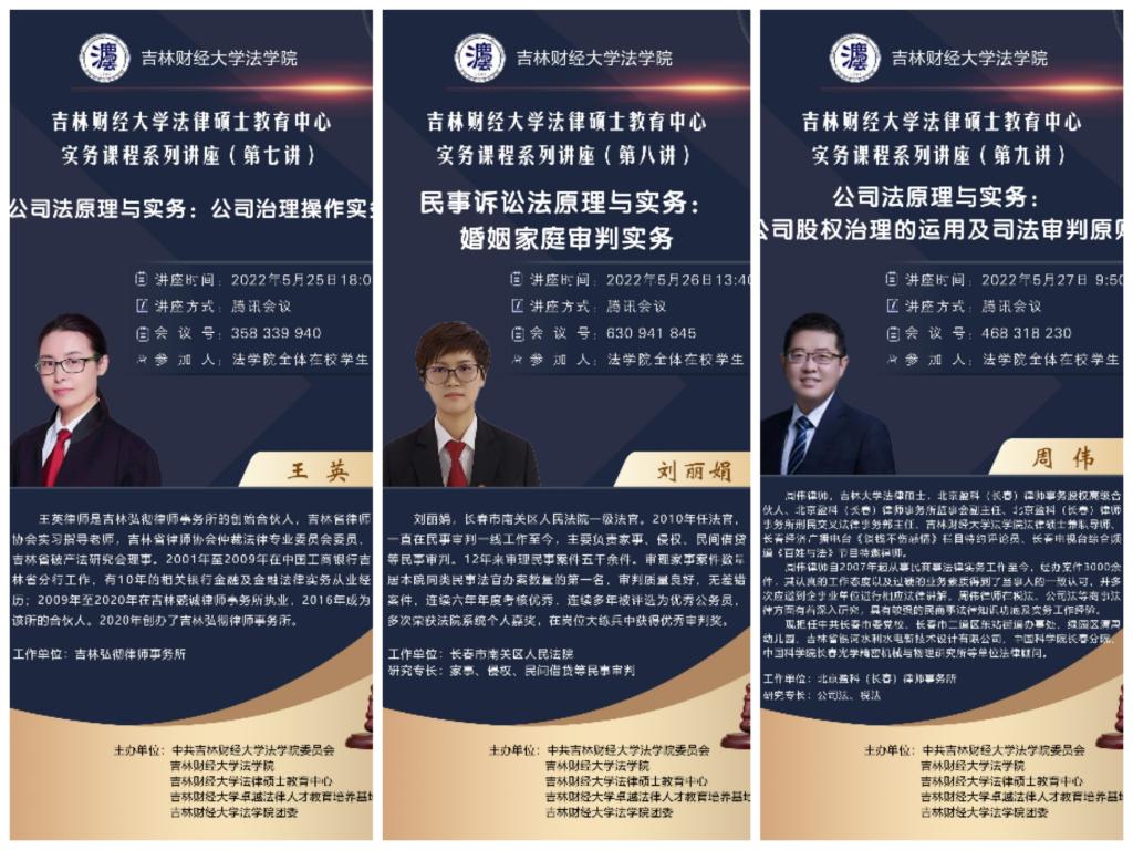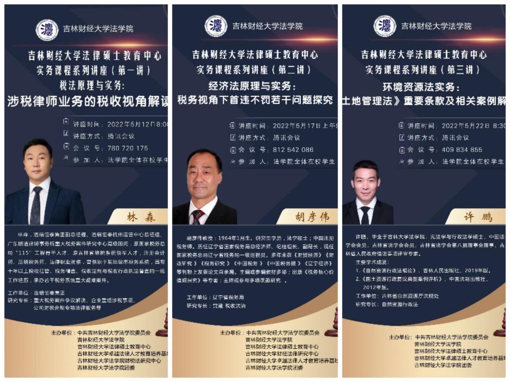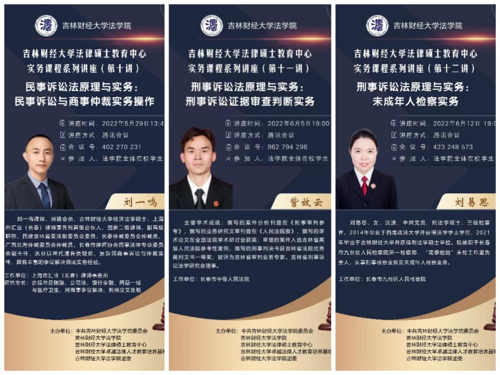 系列讲座阵容豪华、“众星云集”,聘请了来自不同专业领域的实务专家,分别为浩瑞恒泰集团副总经理林森,辽宁省税务局一级巡视员胡彦伟教授,吉林省自然资源厅法规处处长许鹏,吉林省民政厅政策法规处处长马城屹,吉林省人民检察院第八检察部副主任孙莉婷检察官,吉林省高级人民法院民事审判第一庭副庭长杨迪,吉林弘彻律师事务所创始合伙人王英,长春市南关区人民法院一级法官刘丽娟,北京盈科(长春)律师事务所股权高级合伙人周伟律师,上海市汇业(长春)律师事务所高级合伙人刘一鸣,长春市中级人民法院法官訾效云,长春市九台区人民检察院检察官刘易思。讲座吸引了大批法学院学生、老师和其他学院的学生、老师以及已经毕业的法学院学生和校外感兴趣的同行上线学习、观摩。