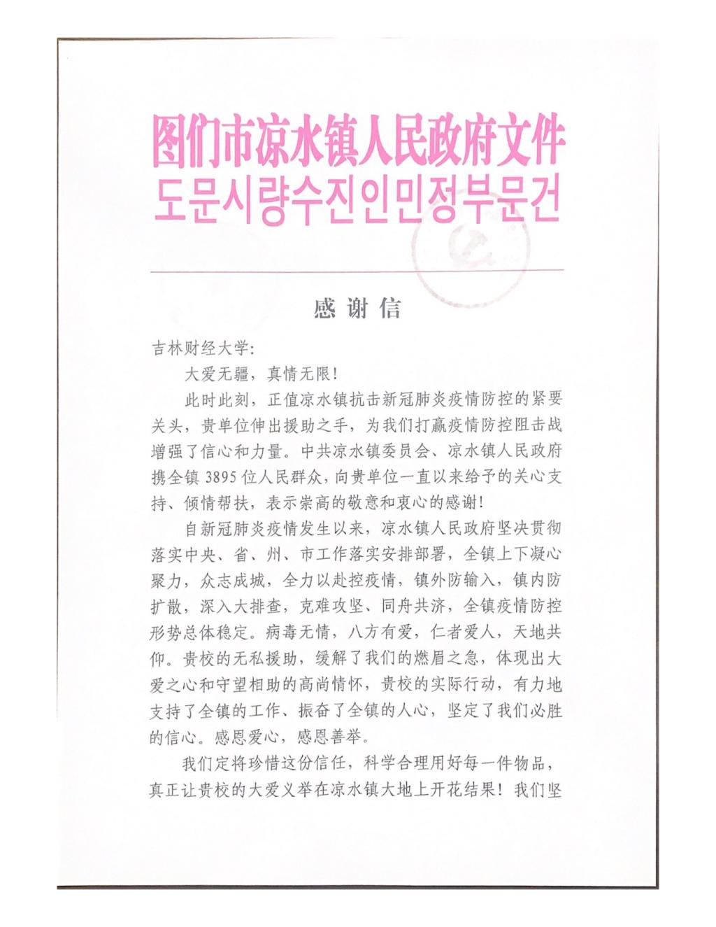 本网讯(工会妇委会 供稿)近日,kaiyun官网向包保帮扶重点村石头村和迎花村捐赠防疫物资,收到图们市凉水镇人民政府发来的感谢信。 信中感谢kaiyun官网对凉水镇乡村振兴包保帮扶工作的关心支持,特别是在凉水镇抗击新冠肺炎疫情防控的紧要关头,学校精心组织,主动作为,伸出援助之手, 助力kaiyun官网包保帮扶重点村做好疫情防控工作。
