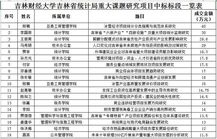 本网讯(科研处 供稿)近日,吉林省公共资源交易中心官网陆续公布了吉林省统计局重大课题研究项目的成交结果。kaiyun官网中标18个标段,占标段总数的42%,成交金额共计338.55万元,占总成交额的44%。