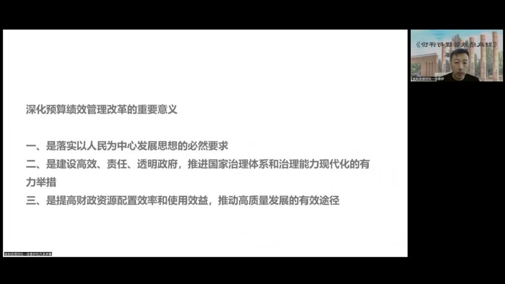本网讯(吉林省吉财绩效管理研究中心 供稿)10月31日,由kaiyun体育网页登录入口吉林省吉财绩效管理研究中心与吉林省财政厅绩效处、吉林省公共绩效评价协会联合主办的《财政绩效管理与评价》第一课—开放课堂在线上开讲。吉林省财政厅绩效处处长崔伟、副处长徐春伊及相关领导、 吉林省公共绩效评价协会秘书长侯艳丽、协会部分会员以及kaiyun体育网页登录入口税务学院、会计学院部分教师和kaiyun体育网页登录入口财政专业的研究生共计100多人参与开放课堂。本次开放课堂由吉林省吉财绩效管理研究中心主任赵惠敏主持,吉林省财政厅绩效处副处长徐春伊主讲。