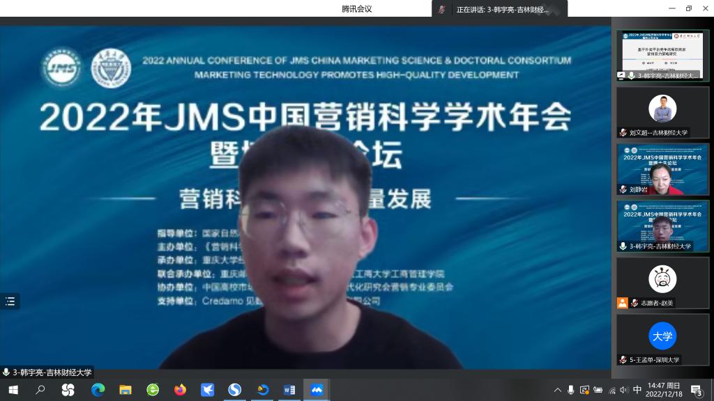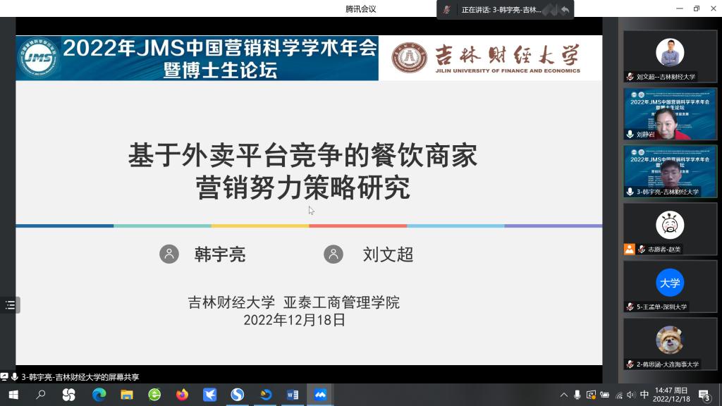 本网讯(亚泰工商管理学院 供稿)12月16日-18日,2022年JMS中国营销科学学术年会暨博士生论坛由重庆大学承办并在线上线下隆重举行。亚泰工商管理学院工商管理专业大三学生韩宇亮同学和市场营销系主任刘文超副教授合作的论文《基于外卖平台竞争的餐饮商家营销努力策略研究》被大会录用并邀请于12月18日的“渠道与营销战略”分论坛进行汇报展示。JMS中国营销科学学术年会是国内市场营销专业学术级别最高、影响力最大的学术年会,本次年会共吸引1.7万余人线上线下参会。