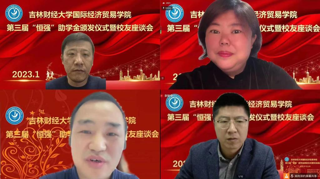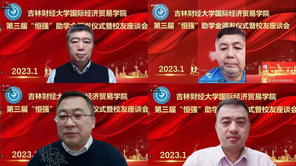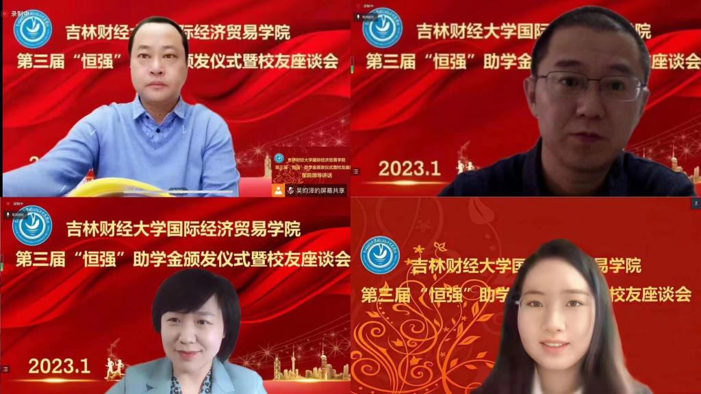 本网讯(国际经济贸易学院 供稿)2023年1月13日上午,国际经济贸易学院举办了第三届“恒强”助学金颁发仪式暨校友座谈会。学校党委副书记刘鹤,亚泰工商管理学院组织员袁贵成,北方人才资源投资集团有限公司董事长、长春校友会秘书长巩汉春,北京贤智汇咨询有限公司董事长宋晓恒,杭州亿涞光电股份有限公司董事长邵志强,吉林谦行谦得科技有限公司总经理高源,恬爱贸易有限公司经理王存禄,学校党委学生工作部部长、校团委书记赵彦双,学校招生就业处处长、校友办公室主任蒋武鹏,国际经济贸易学院党总支书记刘宇涛,副院长王素玉,学院党总支副书记王萌,学院团委副书记刘恩泽,辅导员白琳、孙婉洋及获得2021年和2022年恒强助学金资助的11位学生与各年级的学生代表参加了此次活动。本次会议于线上举行,国际经济贸易学院院长关嘉麟主持了会议。