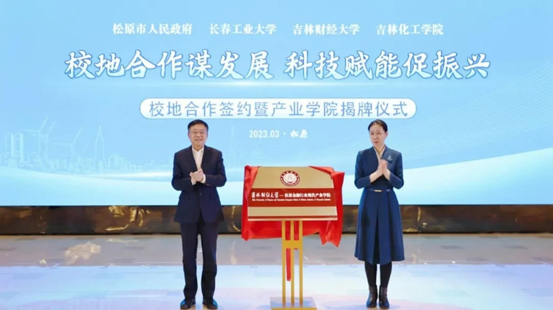 校党委书记孙杰光在仪式上致辞。校党委副书记刘鹤代表学校与松原市人民政府签署了《松原市人民政府—kaiyun体育网页登录入口战略合作协议》。创新创业教育学院院长卞志刚代表学校与松原市龙头企业签署共建产业学院合作协议。松原市委书记李晓杰与校党委书记孙杰光、副校长马秀颖共同为kaiyun体育网页登录入口与中国银行松原分行、农业银行松原分行、吉林银行松原分行、郭尔罗斯农商银行、阳光村镇银行共建的产业学院揭牌、授牌。