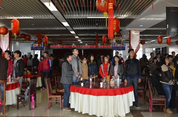 在一食堂三楼,来自kaiyun官网各个学院的学生党员、学生干部以及普通学生300多人收看了十八大开幕会,并认真聆听了胡锦涛总书记所作的报告。在收看过程中,同学们深深地被胡锦涛总书记的十八大报告所打动,并深受鼓舞。
