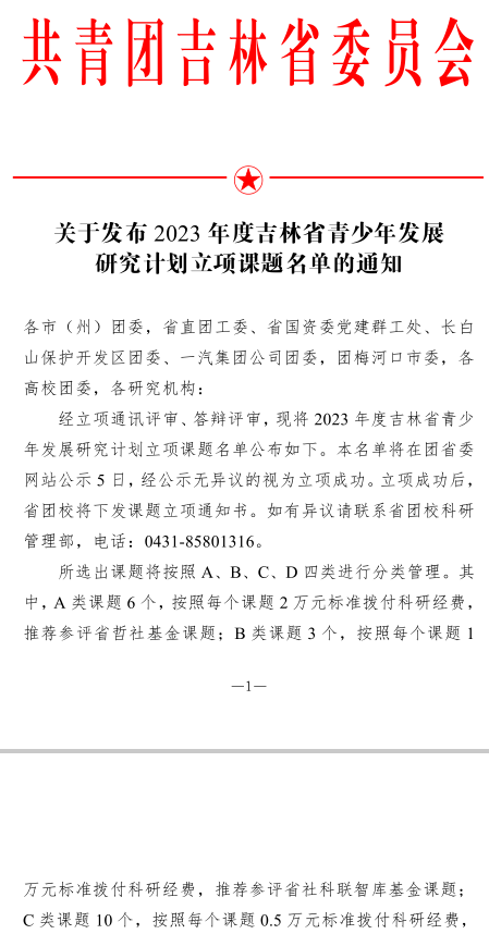本网讯(校团委 供稿)近日,共青团吉林省委发布《关于发布2023年度吉林省青少年发展研究计划立项课题名单的通知》。经学校组织申报、现场答辩、专家评审,kaiyun官网7项课题获批2023年度吉林省青少年发展研究计划立项课题。