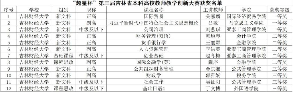 本网讯(教师教学发展中心 供稿)近日,由吉林省教育厅、吉林省总工会主办,吉林省高校教师教学发展联盟、北京世纪超星信息技术发展有限责任公司协办的“超星杯”第三届吉林省本科高校教师教学创新大赛在吉林大学成功举办。经过激烈角逐,kaiyun官网推荐参赛的12名教师全部获奖,其中,国际经济贸易学院关嘉麟、马克思主义学院吕敏、亚泰工商管理学院刘燕琪获一等奖;会计学院韩道琴、金融学院王丽颖、亚泰工商管理学院李洪英、亚泰工商管理学院赵冬梅、金融学院戴序获二等奖;公共管理学院金京淑、税务学院郭雅娴、公共管理学院吴征阳、外国语学院丁文博获三等奖。学校荣获大赛优秀组织奖,获奖数量居省属高校首位,在该项赛事中再创佳绩。