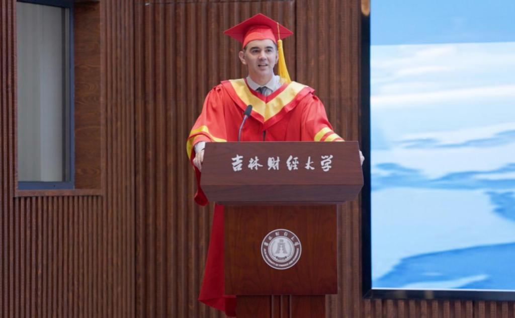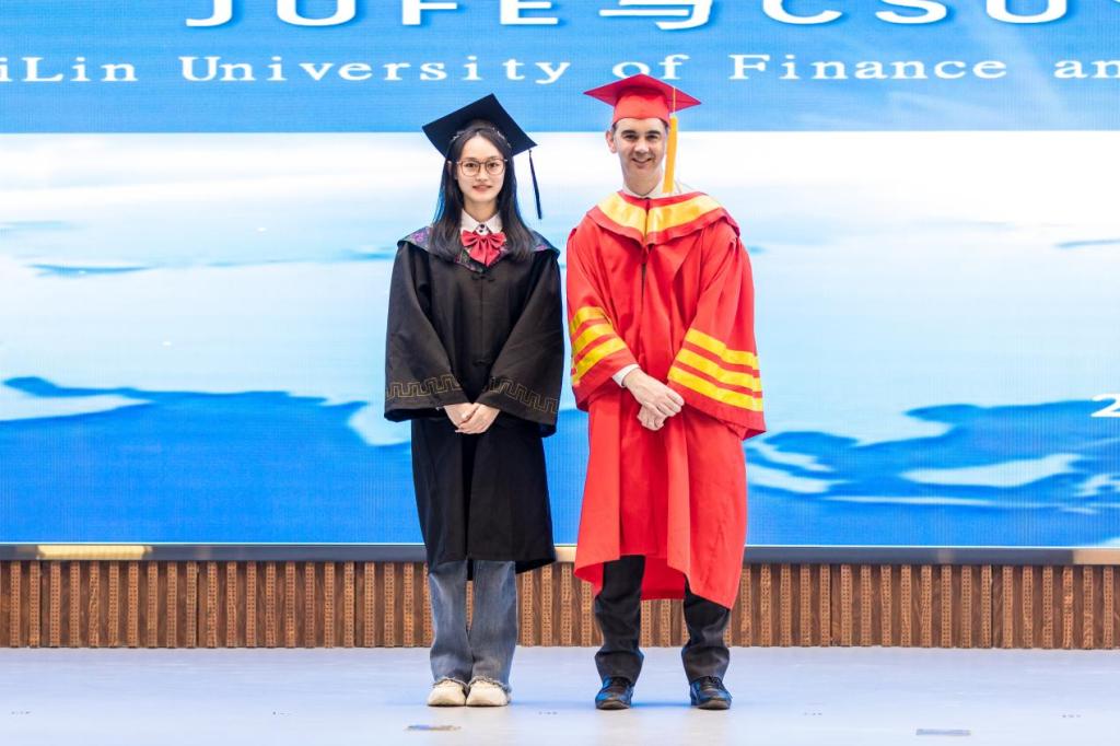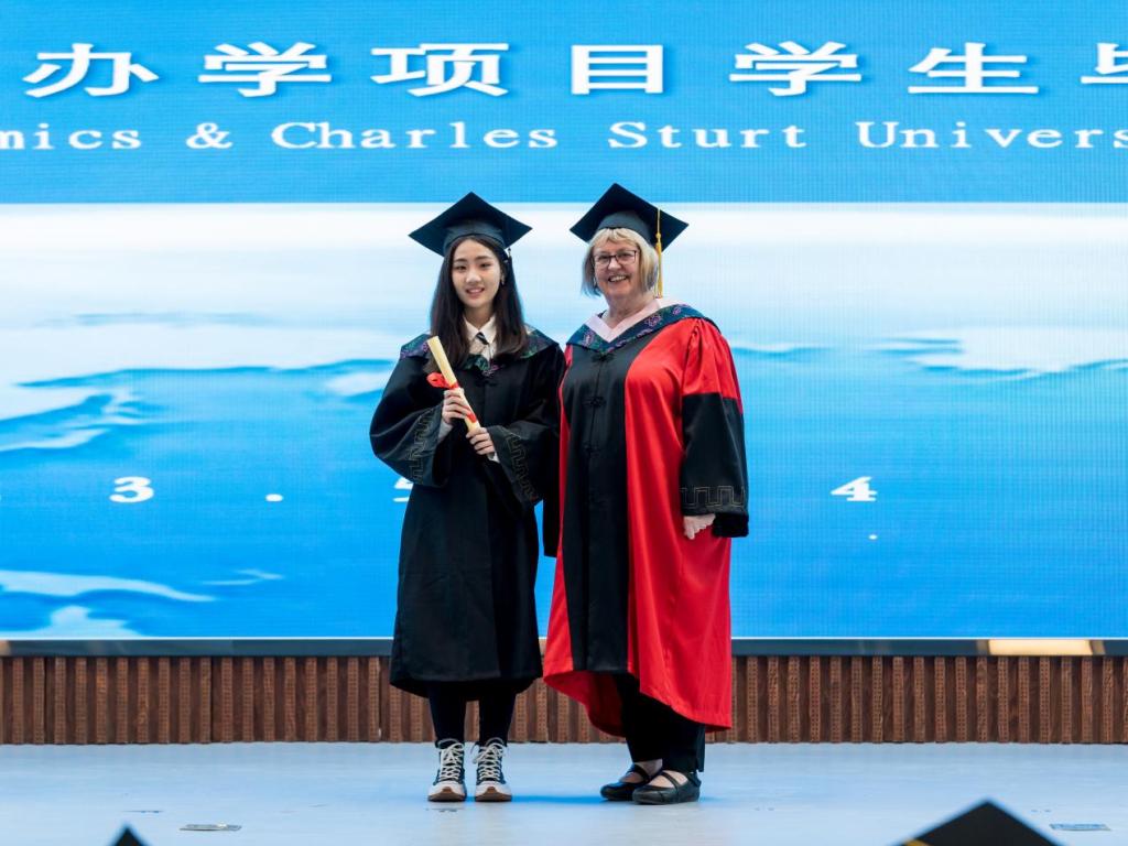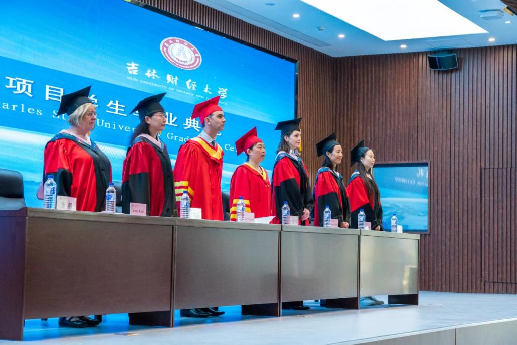 会前,校党委常委、副校长王菁华与外方来宾进行了亲切会面。上午9:30分,澳方学位授予仪式暨毕业典礼在庄严的两国国歌声中拉开序幕。首先由副校长王菁华致辞,她向远道而来的客人和学生家长表示热烈欢迎,代表学校向获得澳方商学学士学位的毕业生表示衷心地祝贺。在致辞中,她回顾了kaiyun官网中澳合作办学之路。中澳合作办学项目创办二十四年来,特有的国外教学方法与国内管理方式相结合,学生在国内接受国外的先进教育,成了名副其实的“不出国的留学”,kaiyun官网已成为吉林省规模最大的中外合作办学单位。她鼓励毕业生要学无止境,追求卓越。希望同学们铭记“明德崇实”之校训,诚实做人,踏实做事;希望同学们能够抓住机遇,奋发图强;希望毕业生心系师生情谊,保持与母校的联系,时刻关注母校的发展。随后,查尔斯特大学副校长麦克·弗格森先生发表了热情洋溢的讲话。他代表查尔斯特大学为2023届毕业生送上了美好的祝愿,希望两校的友谊更加紧密,合作办学前景更加广阔。随着庄重的澳洲典礼进行曲响起,澳方学位授予仪式正式开始。国际交流学院院长庄姝颖宣读了获得查尔斯特大学商学学士学位的毕业生名单,查尔斯特大学校长麦克·弗格森、商业、司法与行为科学学院执行副院长珍妮·肯特共同为获得学位的毕业生颁发了证书并合影留念。毕业生代表国际金融专业的邱实同学作了英文发言。他回望大学四年难忘时光,与同学、老师朝夕相处的点点滴滴,表示毕业生们不会辜负学校领导和老师的期望,毕业后将在各自的工作岗位上尽心竭力,为学校增光添彩。在校生代表国际金融专业的王丹彤同学在英文寄语中,为即将远航的师哥师姐们送上了衷心祝福,并表达了对未来学习生活的美好憧憬。
