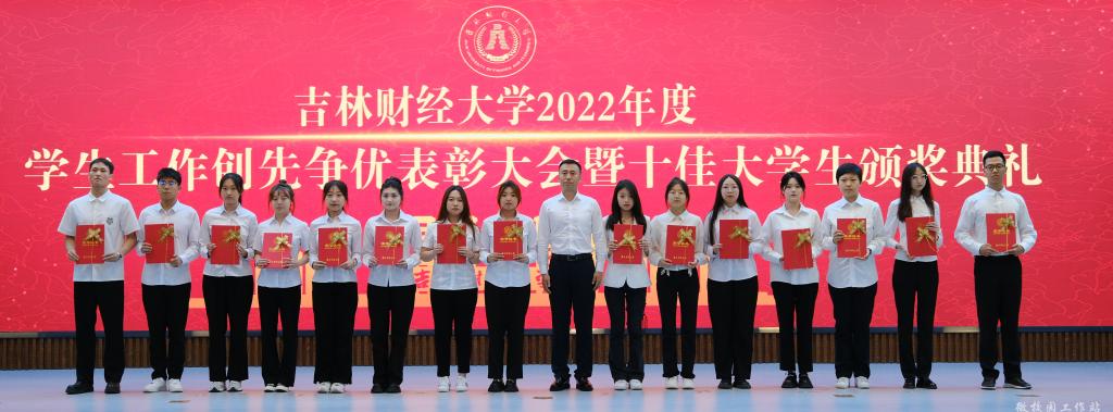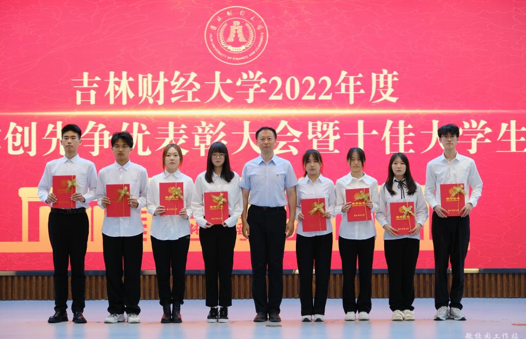 在随后进行的十佳大学生颁奖典礼仪式上,新闻与传播学院杨淞喆、外国语学院李之恒、税务学院邱健文、国际经济贸易学院陈淑婷、金融学院谷佳忆、管理科学与信息工程学院丁方一、金融学院赵恩泽、会计学院王雅岚、国际交流学院张怡诺、统计学院王馨悦十名荣获2022年度十佳大学生荣誉称号的同学受到了表彰。视频展播了十佳大学生的成长故事,十佳大学生的辅导员为他们宣读了颁奖词,各学院党委(党总支)书记、院长为本学院十佳大学生颁发了奖牌和荣誉证书,获奖学生分别发表了感言,表达了自己获得这一殊荣的欣喜和对学校培养的感激之情。