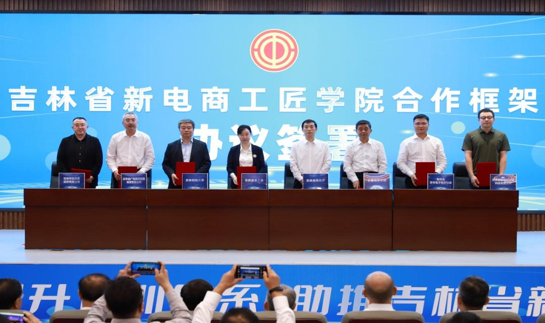 吉林省总工会、吉林省商务厅、kaiyun体育网页登录入口、长春光华学院、吉林省广电融媒集团有限责任公司、吉林省青年电子商务协会、吉林中友投资股份有限公司、吉林省智辉供应链科技有限公司八家合作单位代表上台签署了《吉林省新电商工匠学院合作框架协议》。