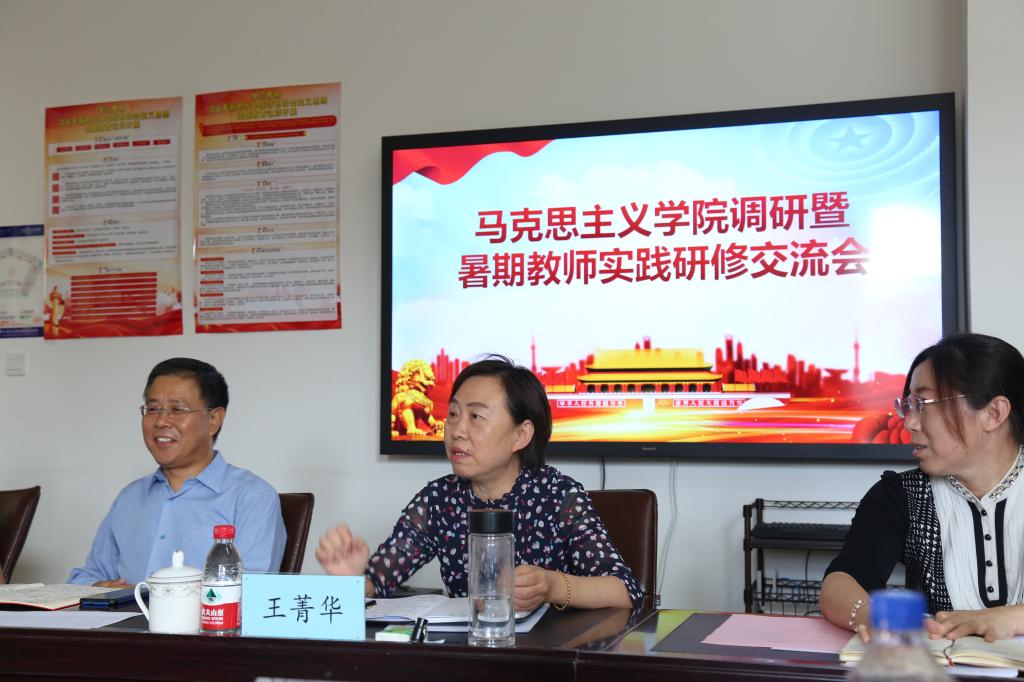 学校副校长王菁华结合教师汇报和迎评促建作了工作交流。她充分肯定了马克思主义学院此次有组织的教师实践研修活动取得的成果,从感同身受和回归本职两个方面与全体教师进行了交流。谈到感同身受,她指出,身受才能感同,学院这次暑期研修实践活动让理论与实践的结合更加紧密,进一步促进了思政课教学建设,也为人才培养模式改革提供了有益的借鉴。谈到回归本职,她指出,每一位教师都能坚持问题导向,结合研修活动中遇到的案例联系实际工作,再回归到思政课堂教学本职,提出了很多具有建设性的措施。同时,她希望每位教师进一步总结凝练实践研修内容,争取在某些方面形成具有一定推广意义的范例或成果,进一步推动学校思政课教学改革走深走实,产生积极的示范效果。