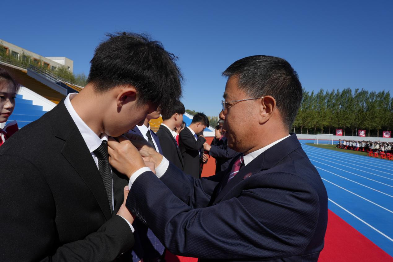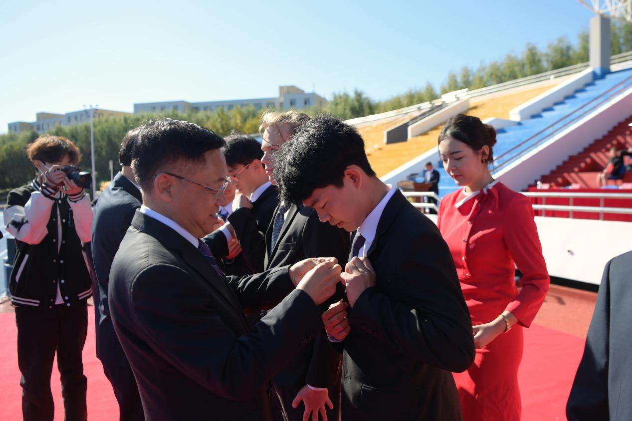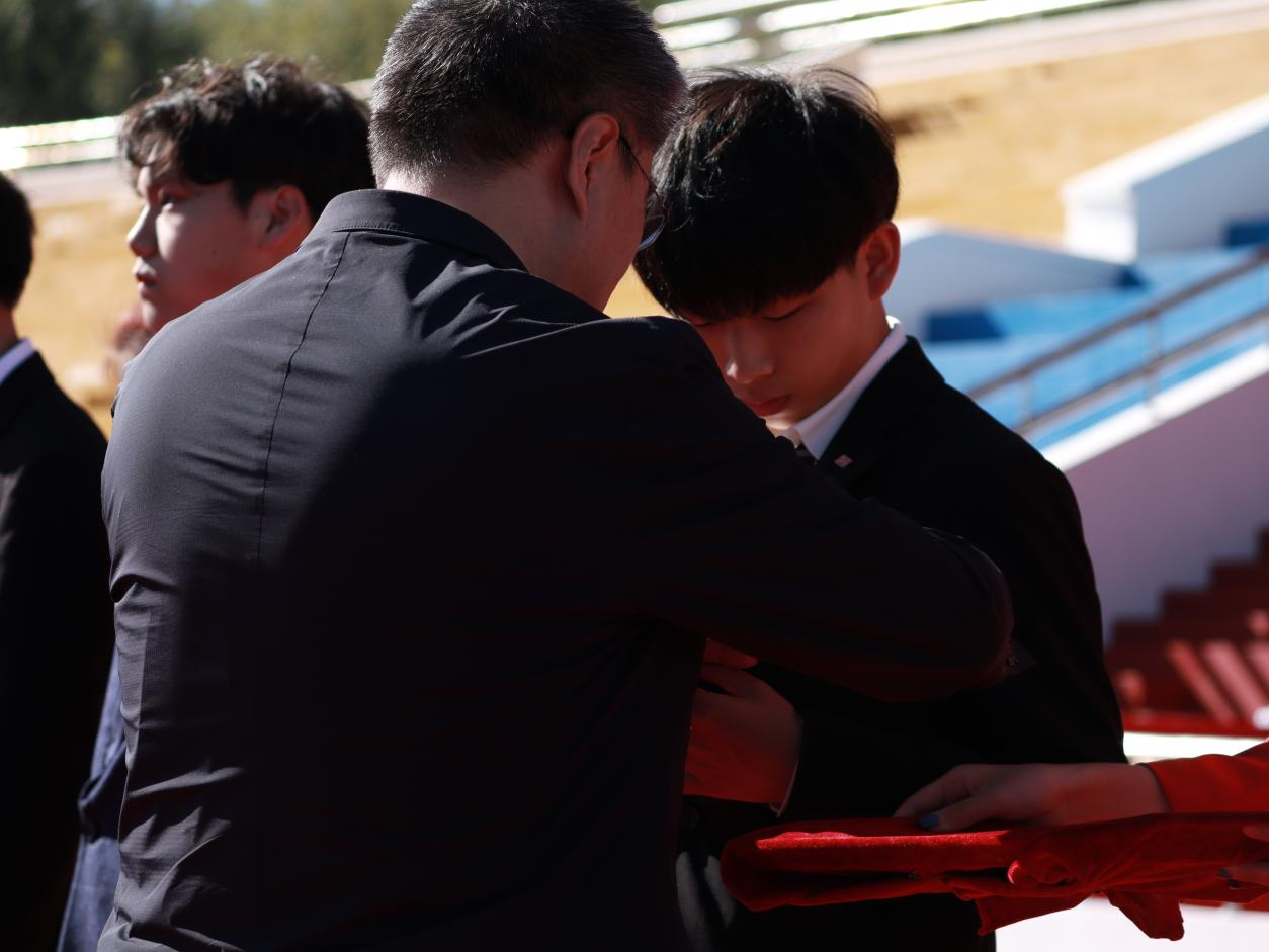 开学典礼在热情洋溢的青春歌舞中拉开序幕。晨光微曦,五星红旗在雄壮的国歌声中冉冉升起;秋风习习,校旗在校歌声中肆意飘扬。升旗仪式后,与会领导为2023级新生代表佩戴了校徽。