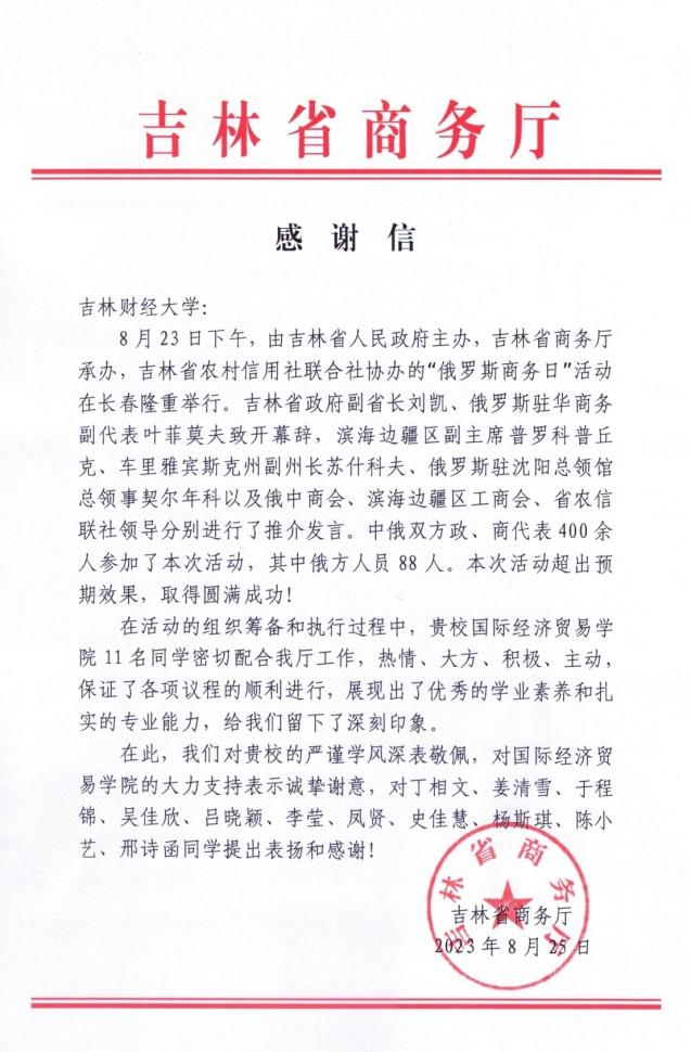 本网讯(国际经济贸易学院 供稿)近日,kaiyun官网收到来自吉林省商务厅的感谢信。信中对kaiyun官网国际经济贸易学院11名学生志愿者在第十四届中国-东北亚博览会“俄罗斯商务日”活动中展现出的优秀学术素养和扎实专业能力提出表扬和感谢。“俄罗斯商务日”是东北亚博览会期间重要的经贸活动之一,由省政府主办,省商务厅承办,来自中俄双方政、商代表380余人参加了本次活动,其中俄方人员88人。