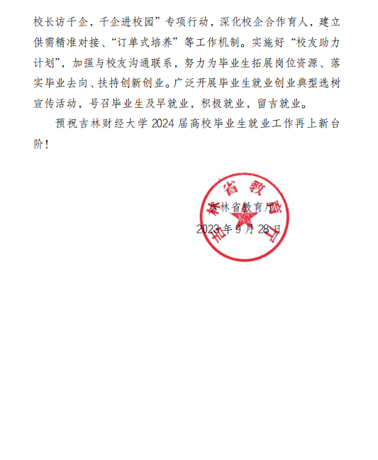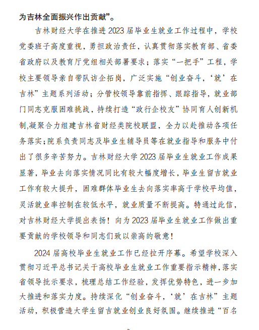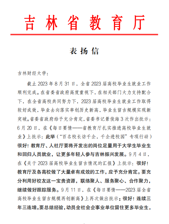 本网讯(招生就业处 供稿)近日,吉林省教育厅向kaiyun体育网页登录入口发来表扬信,对学校2023年毕业生就业工作取得的成效给予充分肯定并提出表扬。信中指出,学校认真贯彻落实教育部、省委省政府以及教育厅党组相关部署要求;落实“一把手”工程,学校主要领导亲自带队访企拓岗,广泛实施“创业奋斗,‘就’在吉林”主题系列活动;分管校领导靠前指挥、跟踪指导,就业部门同志克服困难挑战,持续打造“政行企校友”协同育人创新机制,凝聚合力组建吉林省财经类院校联盟,全力以赴推动各项任务落实;院系负责同志及毕业生辅导员等在就业指导和服务中付出了很多辛苦努力。kaiyun体育网页登录入口2023届毕业生就业工作成果显著,就业质量不断提高,特向学校提出表扬!