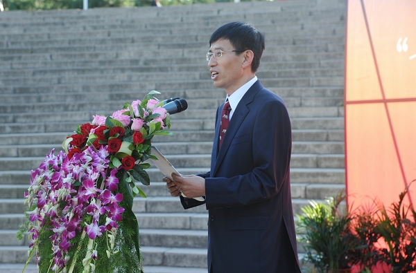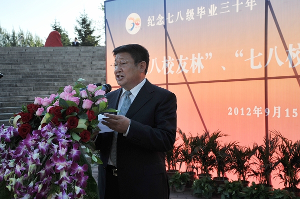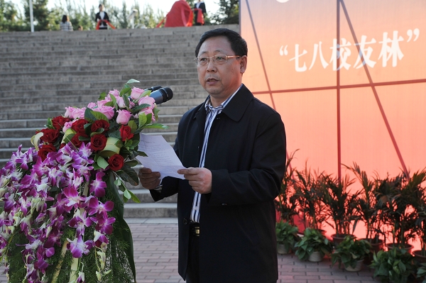 校纪委书记王时刚在仪式上致辞。他说,七八级473位校友每人捐赠一棵树,形成“七八校友林”,出资捐认了这条路,形成了“成才路”,为了见证这一难忘、幸福的瞬间,校友中不少同学千里迢迢回到母校,深深地表达了对母校、对老师的感恩。他希望母校能够成为校友们互通、互助的桥梁,成为校友们心中永远的港湾!
