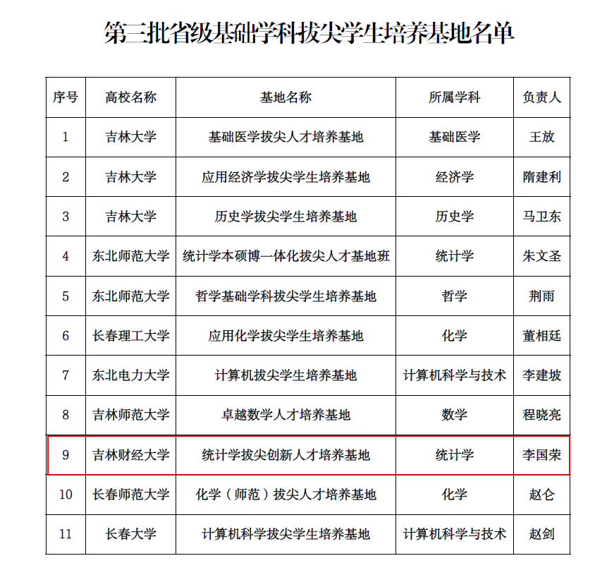 本网讯(教务处 供稿)近日,吉林省教育厅公布了第三批省级基础学科拔尖学生培养基地名单,kaiyun官网“统计学拔尖创新人才培养基地”成功入选,这是kaiyun官网在基础学科拔尖学生创新培养方面取得的又一重要新成果。