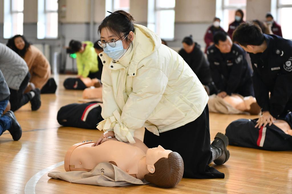 本次培训通过理论讲授、示范演示与实际操作相结合的方式,由校医院宋云、刘凤霞为参加培训人员详细讲解了心肺复苏原理和救护步骤,利用模型演示了心肺复苏(CPR)操作流程和自动体外除颤仪(AED)具体操作方法,并进行了实操。大家怀着对自己和他人生命的敬畏和责任感认真学习每个技术要领,练习得非常认真投入。通过现场讲解和实际操作练习,教职工们了解了应急救护相关知识,掌握了救护基本动作要领。