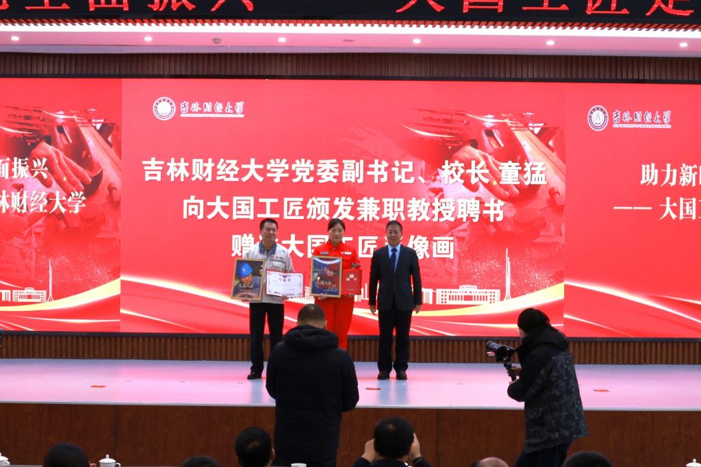 童猛向两位“大国工匠”颁发“兼职教授”聘书、赠送肖像画。两位专家向学生代表赠送“大国工匠”系列图书。