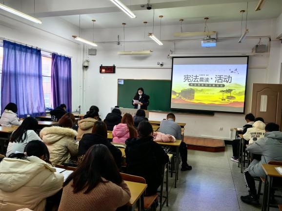 12月4日宪法日当天,学校在教学楼开展宪法宣传周系列活动—“宪法晨读”活动,同步收看全国教育系统“宪法晨读”直播。校党委副书记刘鹤,校党委学生工作部部长赵彦双、校团委副书记孙之光、法学院党委书记高原及法学院师生代表在主会场参加活动,法学院各班级设置了分会场同步进行晨读。活动中,主分会场师生同步跟读宪法部分条款,观看了第八届全国学生“学宪法 讲宪法”活动全国总决赛演讲比赛优秀选手展演,收听了全国人大常委会法工委武增副主任宣讲宪法和教育部孙尧副部长的讲话。