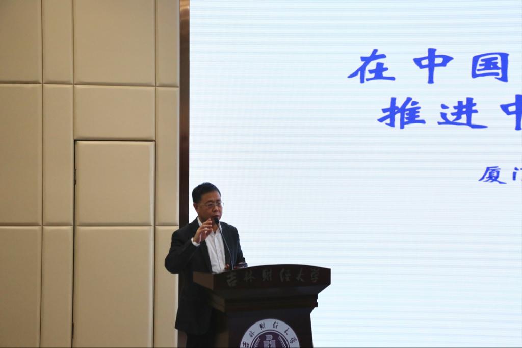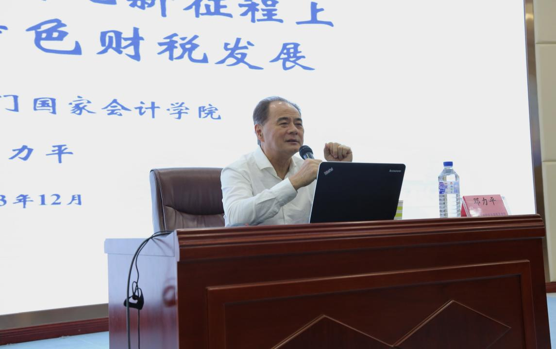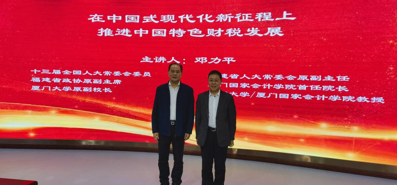 报告中,邓力平深入阐释了中国式现代化的内涵本质,分析了中国特色财税服务中国式现代化的理论和实践逻辑,阐述了推进中国特色财税发展未来需要改革创新的工作路径。他运用国际比较和历史分析的方法,结合个人从事财税理论研究和参与国家财税改革的亲身经历,对新中国成立特别是改革开放以来我国财税制度改革和财税理论创新的历史脉络和重大进展进行了深入解读。他强调社会主义基本经济制度是中国特色社会主义制度的重要支柱,也是我国经济发展的制度基础和财税发展的制度基石。为推进中国特色财税事业发展,必须坚持社会主义市场经济改革方向,构建高水平社会主义市场经济体制,持续推动中国特色财税实践与理论创新发展。他勉励税务学院师生要热爱财税事业,为我国财税事业发展贡献力量。