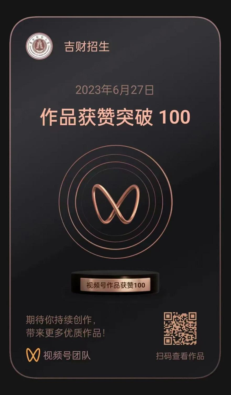 “吉财招生”视频号发布的作品获赞超100!截止2023年7月,“吉财招生”视频号发布的视频作品获63593人次观看,收藏1848人次、2242次转发,2855次点赞!