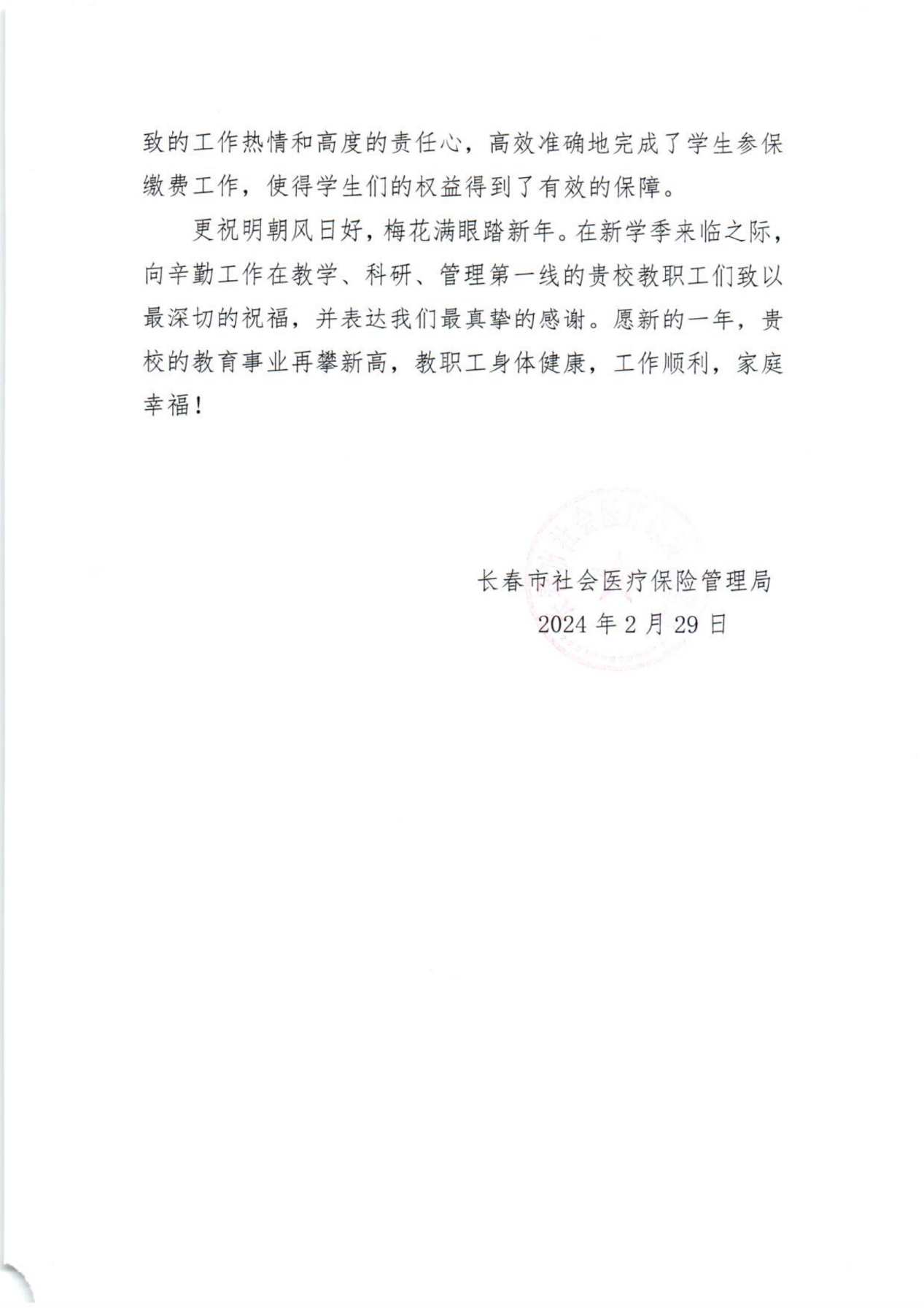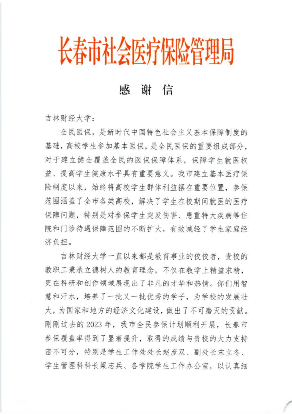 本网讯(党委学生工作部 供稿)3月4日,长春市社会医疗保险管理局向我校赠送感谢信,对kaiyun官网组织学生参加全民医保工作给予高度评价,对kaiyun官网学工队伍、全体辅导员认真落实国家医保政策、精心组织参保工作给予了充分肯定。