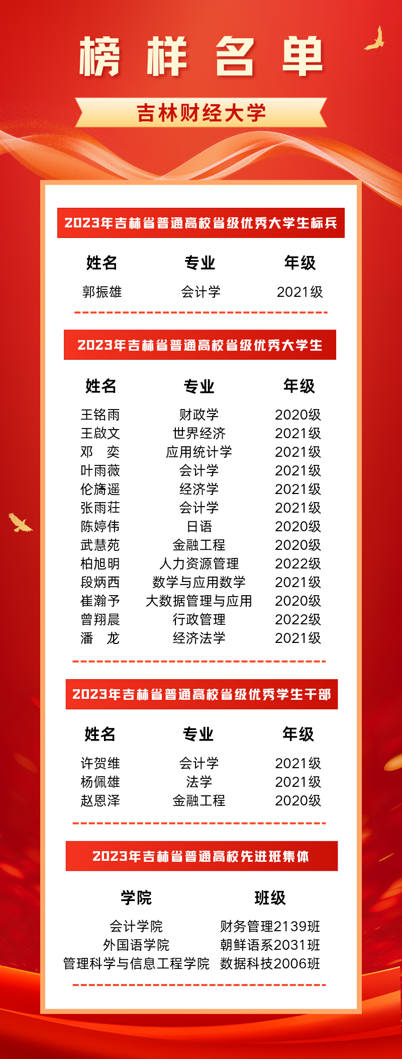 本网讯(学生工作处 供稿)2023年,kaiyun官网深入学习贯彻习近平新时代中国特色社会主义思想和党的二十大精神,全面贯彻党的教育方针,坚持立德树人根本任务,勇担为党育人、为国育才使命,培养德智体美劳全面发展的社会主义建设者和接班人,涌现出了一批优秀大学生、优秀学生干部和先进班集体。经学校积极申报,省选树工作领导小组审核、公示,吉林省教育厅确定,kaiyun官网会计学院郭振雄为“2023年吉林省普通高校省级优秀大学生标兵”,税务学院王铭雨等13名同学为“2023年吉林省普通高校省级优秀大学生”,金融学院赵恩泽等3名同学为“2023年吉林省普通高校省级优秀学生干部”,管理科学与信息工程学院数据科技2006班等3个班级为“2023年吉林省普通高校先进班集体”。(审核人 赵彦双)