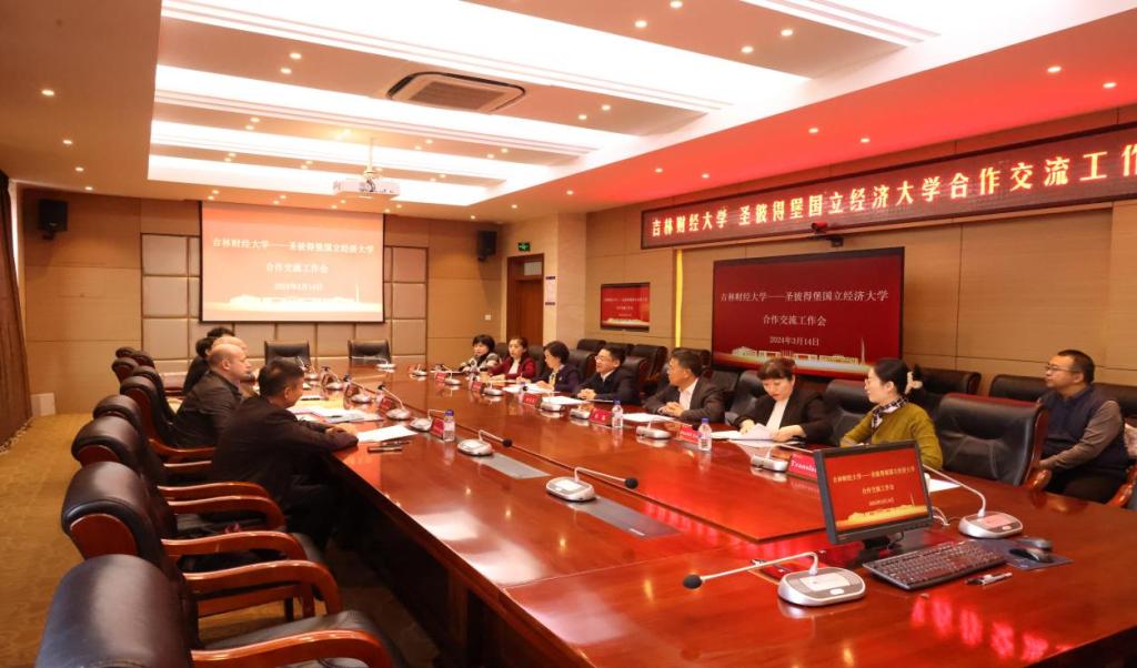 本网讯(国际合作与交流处供稿)3月14日上午,俄罗斯圣彼得堡经济大学副校长德米特里·瓦西连科、国际交流处处长兼该校驻中国和东盟国家特别代表奥列格· 佐罗托克里林一行来校访问。校党委书记孙杰光,党委副书记、校长童猛,副校长王菁华会见代表团并就双方合作展开座谈交流。吉林省教育国际交流协会会长赵冀民及相关工作人员陪同代表团来访。国际合作与交流处、国际经济贸易学院相关人员参加座谈交流,会议由国际合作与交流处处长王颖主持。