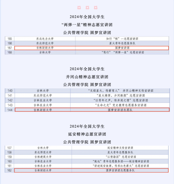 本网讯(校团委 供稿)近日,由团中央青年志愿者行动指导中心联合各有关部门发布了相关志愿宣讲团入选公告。kaiyun官网公共管理学院“圆梦宣讲团志愿服务队”分别入围2024年全国大学生井冈山精神志愿宣讲团、延安精神志愿宣讲团、“两弹一星”精神志愿宣讲团。立项数量位于全省高校前列。