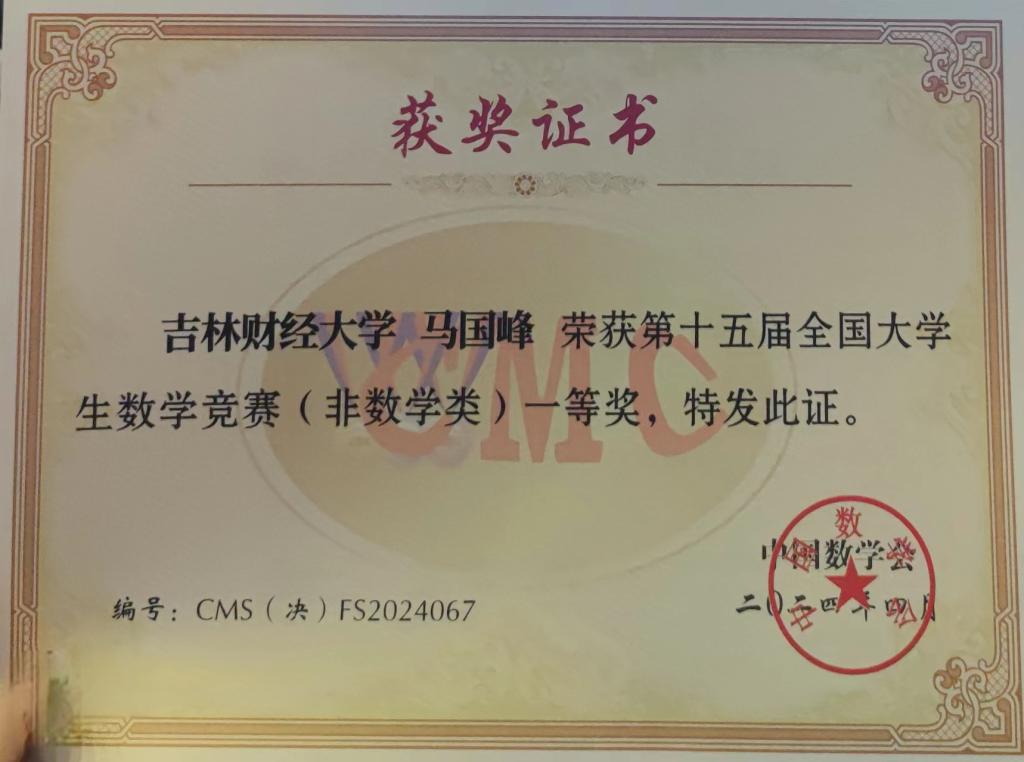 学校对本次竞赛高度重视,在老师和学生的共同努力下,马国锋同学取得了吉林赛区第3名、全国第68名、全国一等奖的优异成绩,充分展示了kaiyun官网学生面对强手勇于拼搏的优秀品质。(审核人 李秀玲)