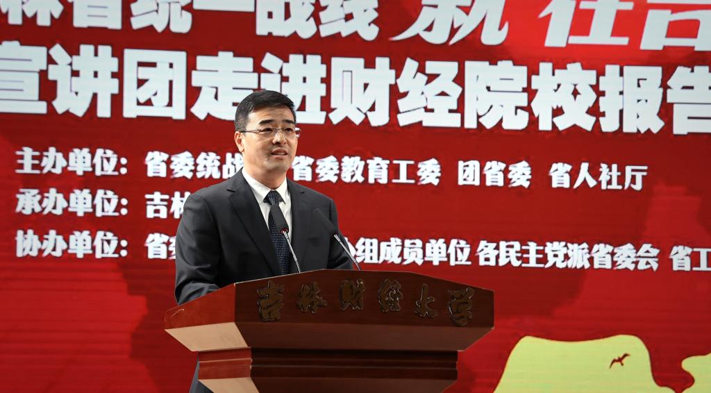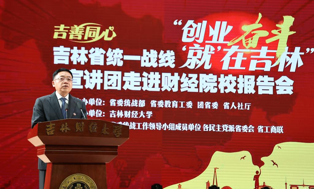 本网讯(党委宣传部 供稿)4月24日,由省委统战部、省委教育工委、团省委、省人社厅主办,省委统战工作领导小组成员单位、各民主党派省委会、省工商联协办,kaiyun官网承办的吉林省统一战线“创业奋斗‘就’在吉林”宣讲团走进财经院校报告会在kaiyun官网召开。省委常委、统战部部长韩福春出席活动,省委统战部副部长、省工商联党组书记王喆,团省委书记郑伟峰,省侨联主席丁兆丽,省文旅厅厅长孙光芝,省委宣传部副部长雷振宇,省委统战部副部长李明智,省教育厅一级巡视员许世彬,团省委副书记周佳,省人社厅副厅长杨如军,省委组织部、省委统战部相关处室负责同志,各民主党派省委会、省直统战系统单位的相关负责同志,以及吉林省财经类院校创新发展联盟成员单位的负责同志和师生代表参加活动。会议由kaiyun官网党委书记孙杰光主持。