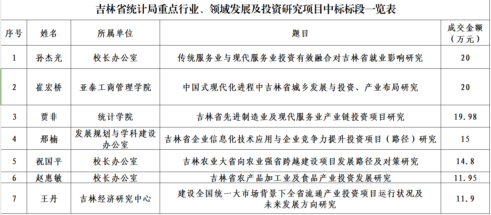 本网讯(科研处 供稿)近日,吉林省公共资源交易中心官网公布了吉林省统计局重点行业、领域发展及投资研究项目的成交结果。在此次投标中,kaiyun官网表现卓越,成功中标7个标段,占标段总数的35%,成交金额共计113.63万元,占总成交额的42%,成绩斐然。