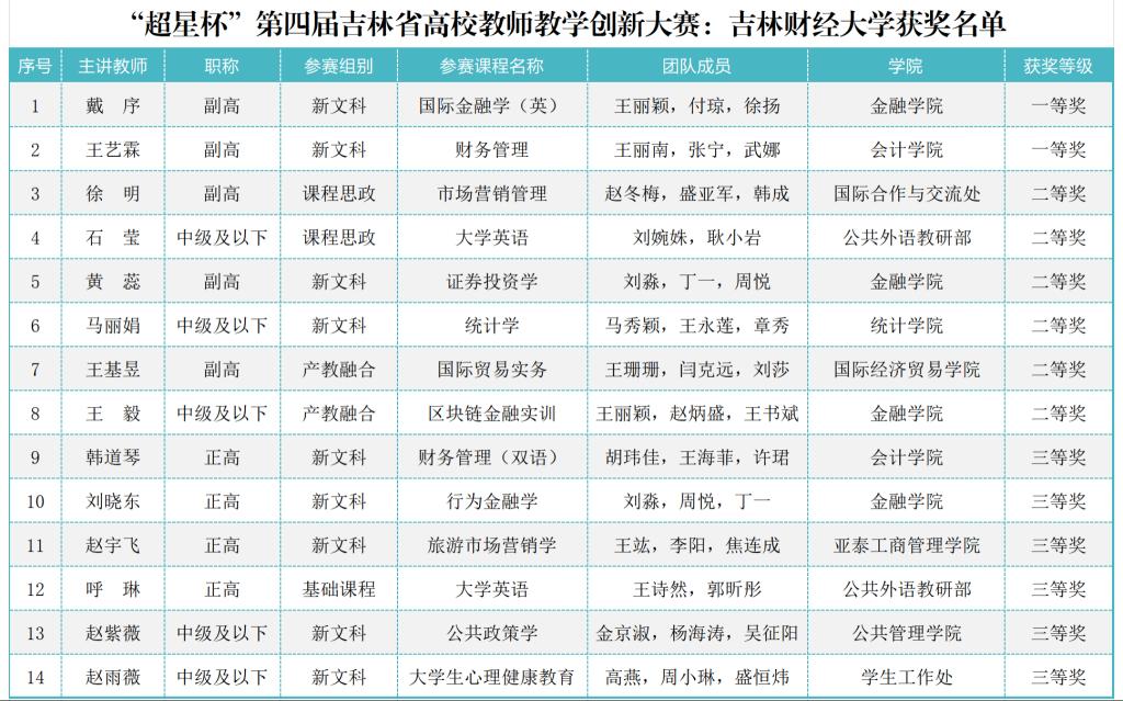 经过层层筛选,大赛共评选出一等奖70项、二等奖102项、三等奖159项,kaiyun官网参赛教师斩获一等奖2项,二等奖6项,三等奖6项。金融学院戴序、会计学院王艺霖等教师荣获一等奖;国际合作与交流处徐明、公共外语教研部石莹、金融学院黄蕊、统计学院马丽娟、国际经济贸易学院王基昱以及金融学院王毅等教师获得二等奖;会计学院韩道琴、金融学院刘晓东、亚泰工商管理学院赵宇飞、公共外语教研部呼琳、公共管理学院赵紫薇以及学生工作部(处)的赵雨薇等教师荣获三等奖,学校获“优秀组织奖”。