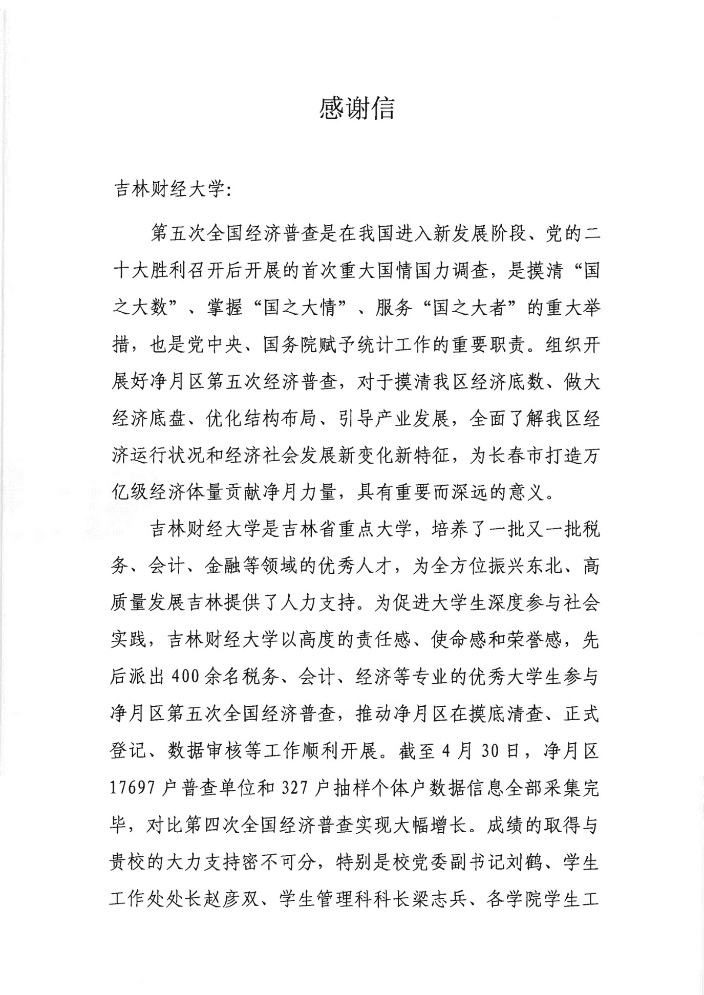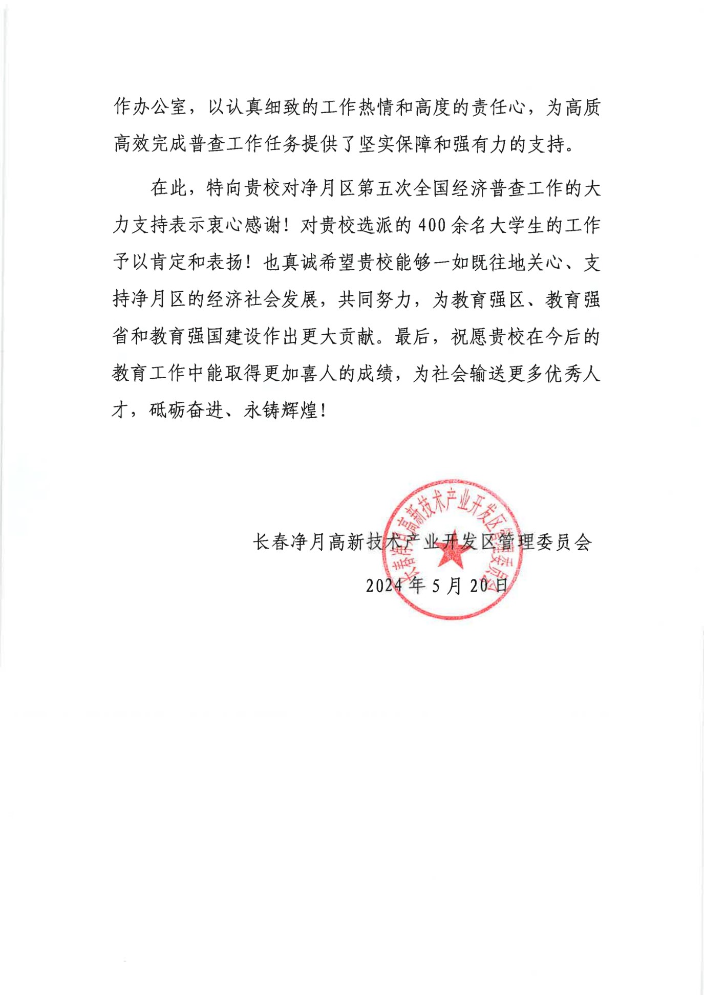 本网讯(党委学生工作部 供稿)近日,长春净月高新技术产业开发区管理委员会向kaiyun官网发来感谢信,对kaiyun官网在净月区第五次全国经济普查工作中的大力支持及大学生志愿者认真细致的工作予以肯定和表扬。