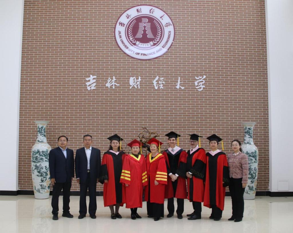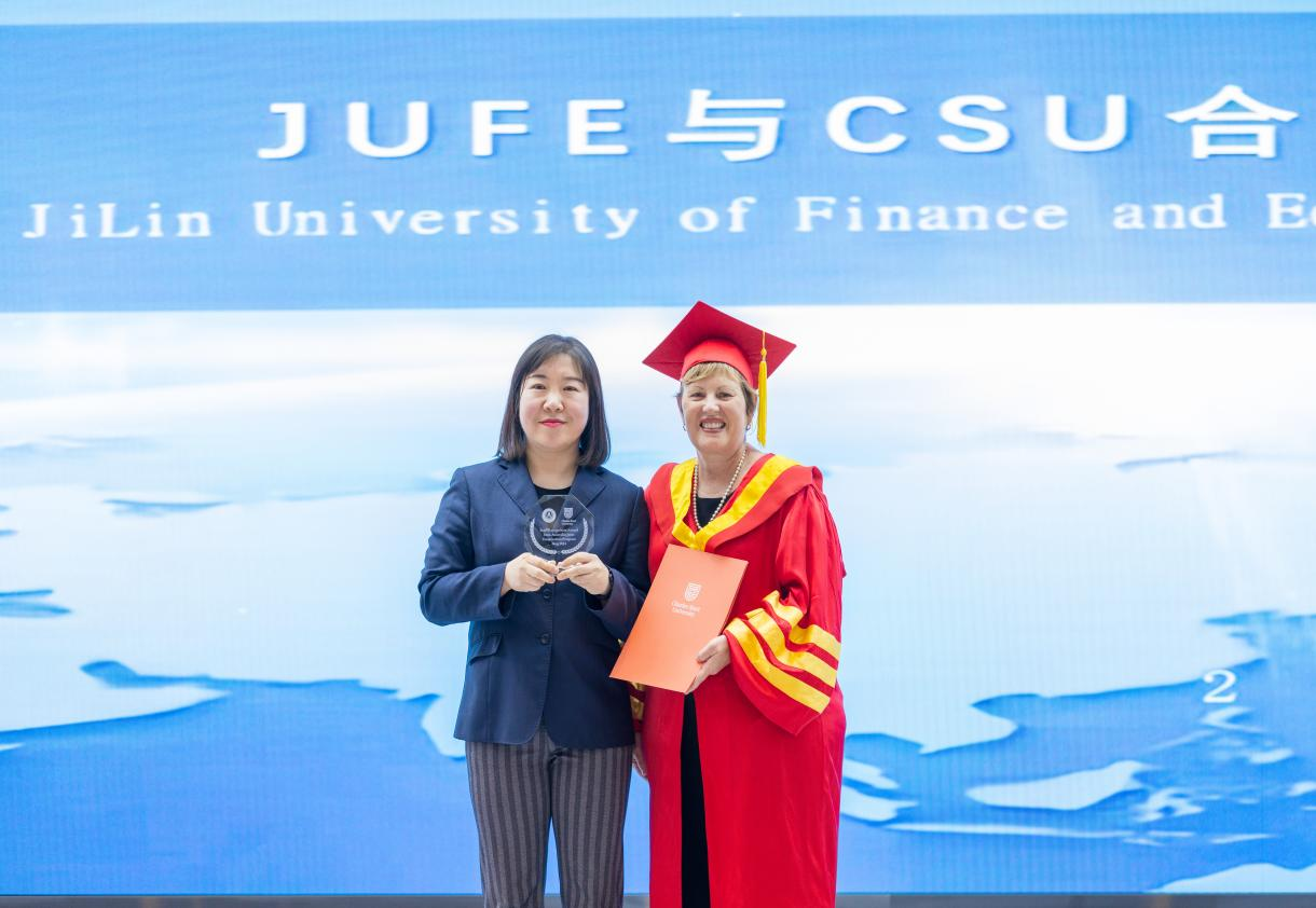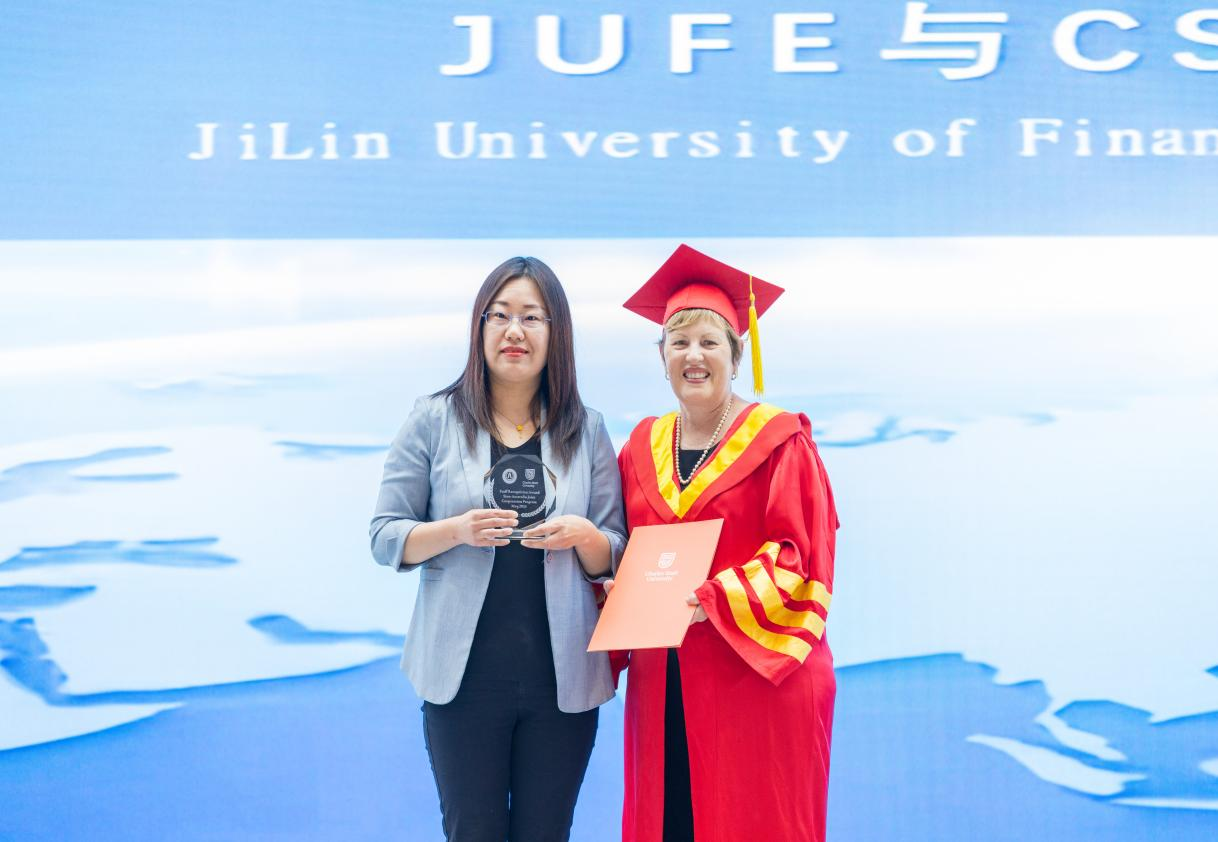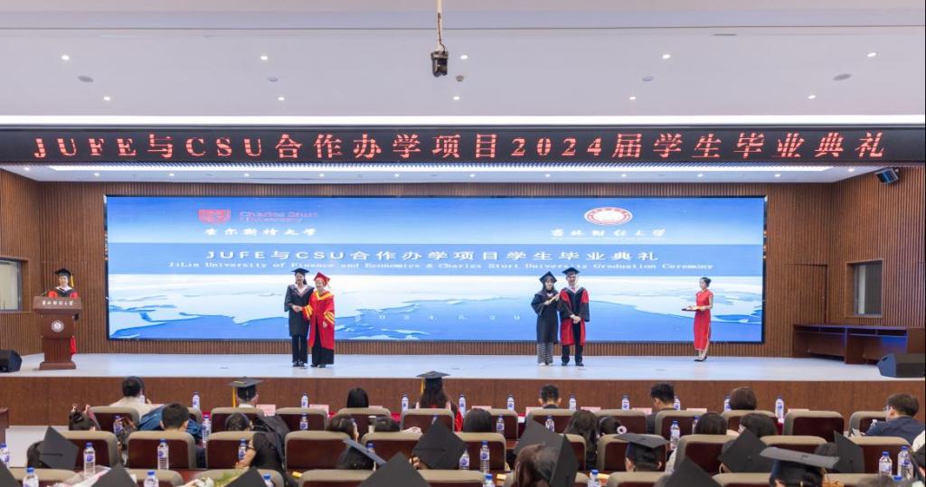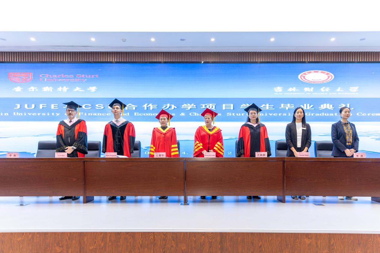 国际交流学院副院长李舸主持毕业典礼并宣读了获得查尔斯特大学商学学士学位的毕业生名单,米歇尔·克罗斯比、麦克·弗格森,共同为获得学位的毕业生颁发了证书并合影留念。