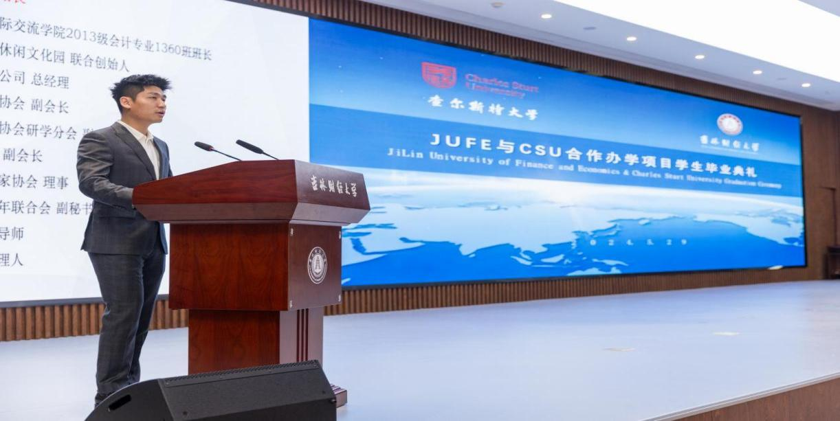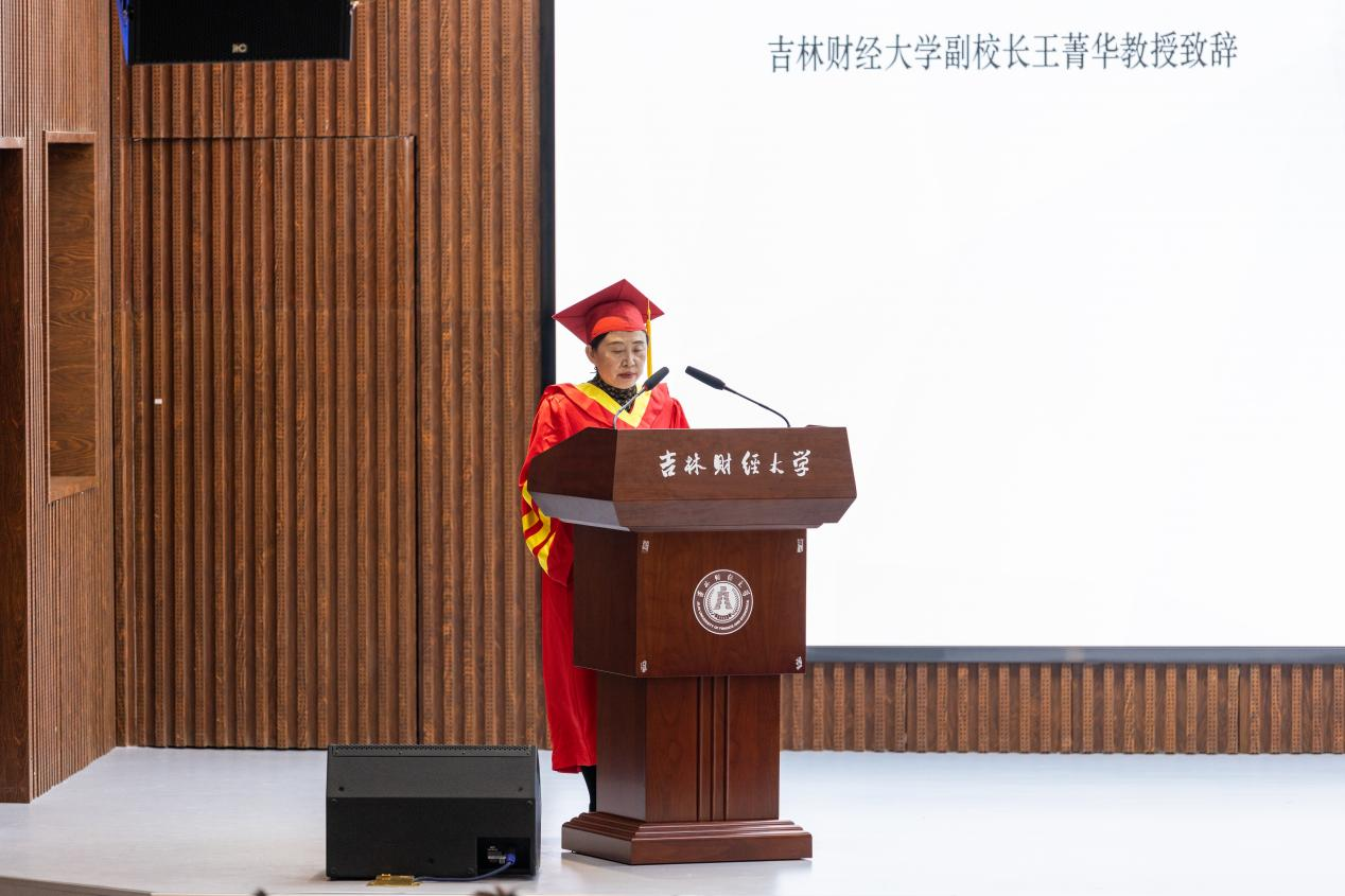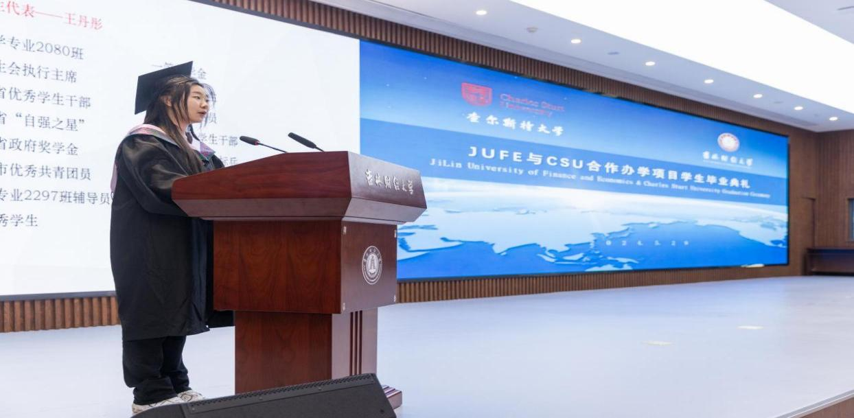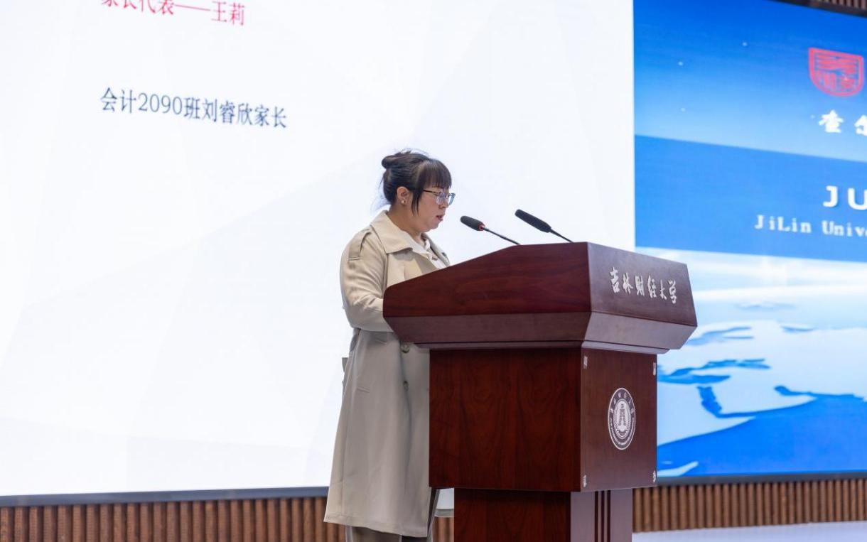 毕业生代表、金融学专业学生王丹彤,校友代表孙语良,家长代表王莉先后讲话,表达对学校、老师的感谢和对同学们的殷殷祝福。