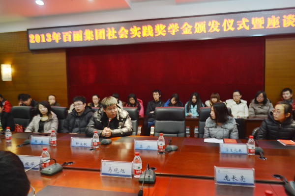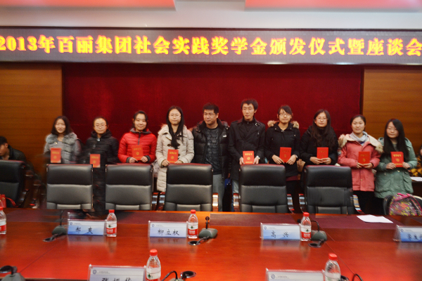 本次奖学金颁发仪式共有两项内容。首先,百丽集团长春分公司人力行政部经理高兴女士宣读了2013年百丽集团社会实践奖学金获奖学生名单。在本次社会实践活动中,应用数学学院谢硕玥同学荣获一等奖学金3000元,张淼、李雪梅、邹佳新等三名同学荣获二等奖学金1500元,籍超男、郭美绫、刘一霞、薛瑞璿、吴昊等五名同学荣获三等奖学金500元。随后,百丽集团长春分公司副总经理柳立权先生为获奖学生颁发了获奖证书和奖学金。