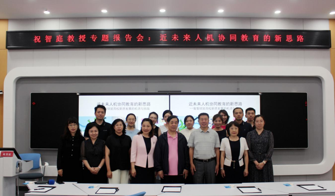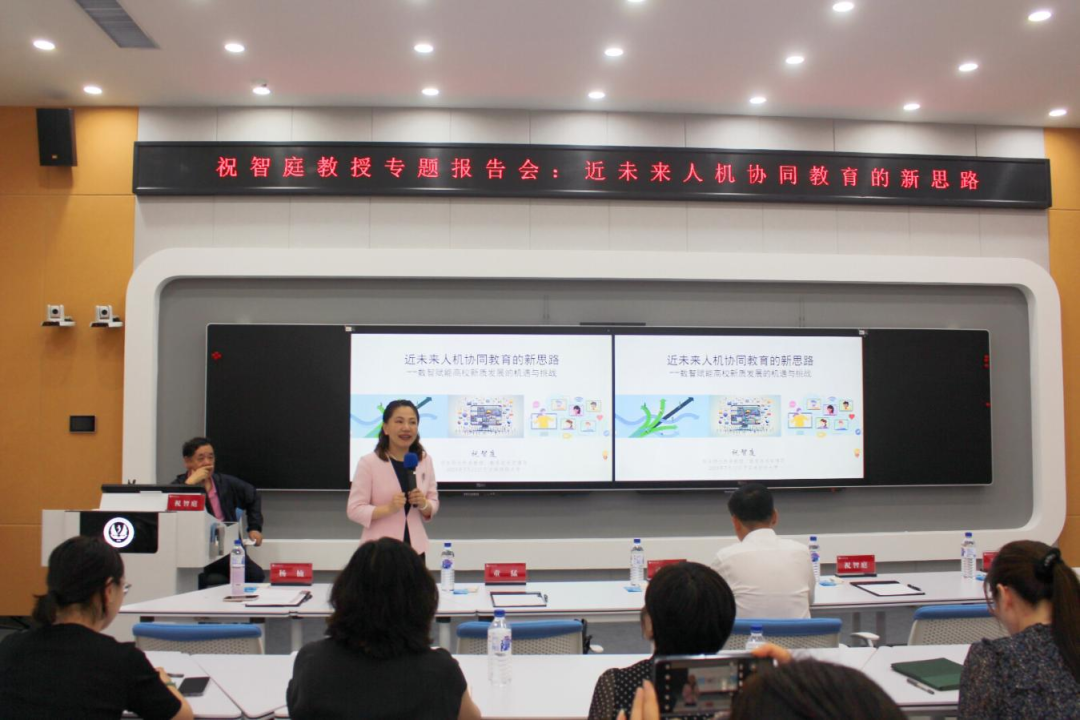 报告会上,祝智庭教授围绕“近未来人机协同教育的新思路——数智赋能高校新质发展的机遇与挑战”这一主题,从人机协同教育的时代背景、核心理念、实践路径等方面展开深入阐述,并结合丰富的案例和研究成果,详细介绍了人工智能、大数据等新兴技术在教育教学中的应用现状和未来趋势。他指出,人机协同教育是未来教育发展的重要方向,高校应积极探索数智技术与教育教学的深度融合,构建新型教育生态,推动教育高质量发展。