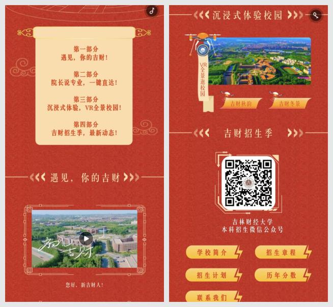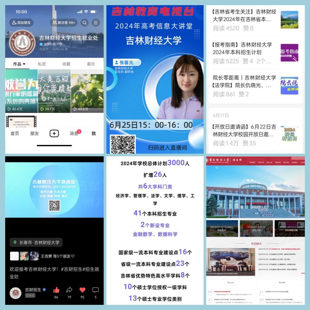 构建多元化宣传咨询模式。学校积极推进“吉财招生”公众号、kaiyun体育网页登录入口本科招生网、抖音官方账号、微信视频号、朋友圈、今日头条等招生宣传新媒体矩阵建设。2024年上半年,在微信公众号、今日头条等平台发布各类招生相关讯息百余条、各类短视频累计浏览量超过了140万人次。开展了“吉财院长说专业”系列直播、吉林教育电视台招生政策解读专场直播,推出“kaiyun体育网页登录入口线上展”“吉财专业巡礼”“十佳学子说专业”“考生关注!吉财报考指南”等招生宣传系列栏目,全方位解读最新招生政策、学科专业优势、人才培养特色、教育教学改革、科研学术成就、校园文化活动。在《2024年本科生招生简章》中新增“校友”“就业”专栏,真实呈现吉财的校友发展和毕业生就业情况,全面展示学校办学成果和社会影响力。举办2024年校园开放日活动邀请考生和家长沉浸式体验学校校园文化;开展“筑梦吉财”第四届“吉财学子高中母校行”活动,近300名吉财学子回到母校高中,传播吉财声音,进一步提升了学校的知名度和影响力。为方便考生和家长咨询,学校积极畅通教育部阳光高考网答疑通道,线上回答考生问题近300条。学校本科招生办公室开通了10部咨询热线电话,在报考期间每天工作时长达12个小时,为考生和家长答疑释惑。