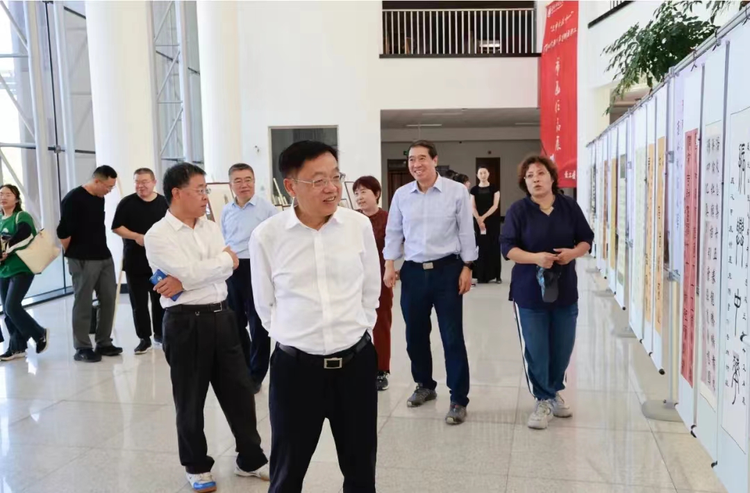 书画作品展览于9月10日中午在综合楼一楼大厅正式开幕,学校领导孙杰光、童猛、岳宏、刘鹤、丁庆东、王菁华、祝国平以及党群部门负责人等参加了此次展览活动。