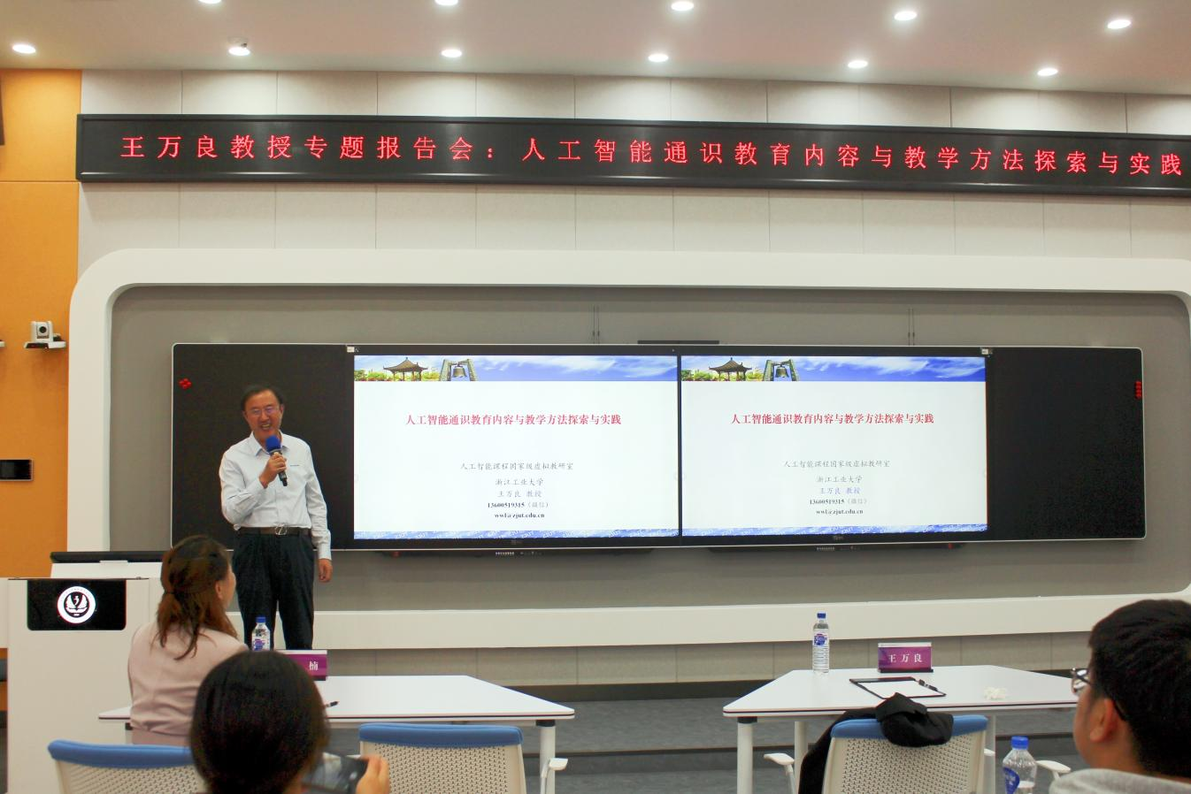 报告会现场气氛热烈,参会教师、研究生就人工智能通识课程建设、教学方法改革等问题与王万良教授进行了深入交流。