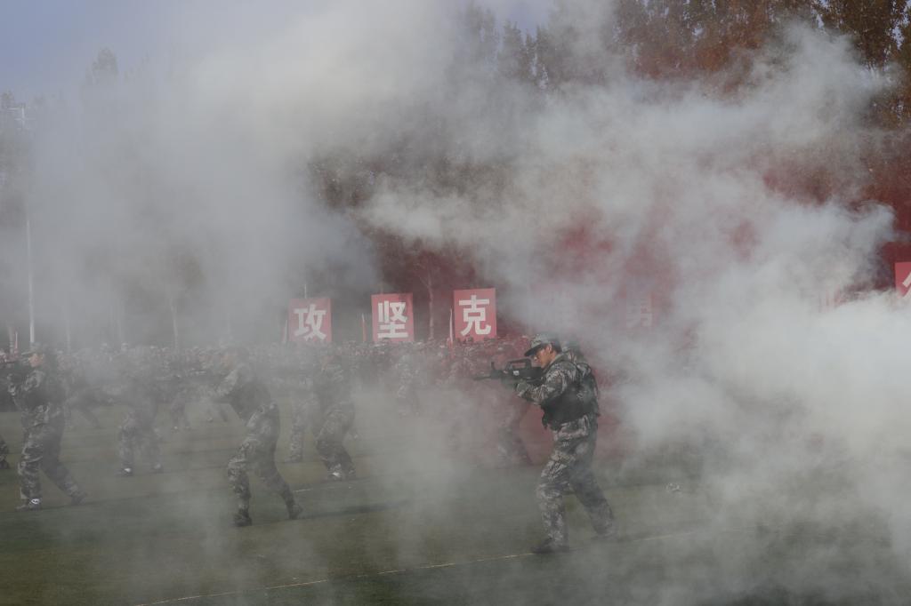 在分列式中,各学院连队以雷霆万钧之势,步伐铿锵有力,每一步都精准地踏在节拍上,展现出军人般的纪律与严谨。紧接着,一场由1000余人共同演绎的军体拳表演震撼上演。这不仅仅是一场视觉盛宴,更是力量与美的完美融合,战术表演方队更是将智慧与勇气发挥到了极致。他们模拟实战场景,灵活运用战术策略,整个动作都显得游刃有余,每位学生的脸上都洋溢着精神饱满、斗志昂扬的神采,交上了一份高质量的军训答卷。