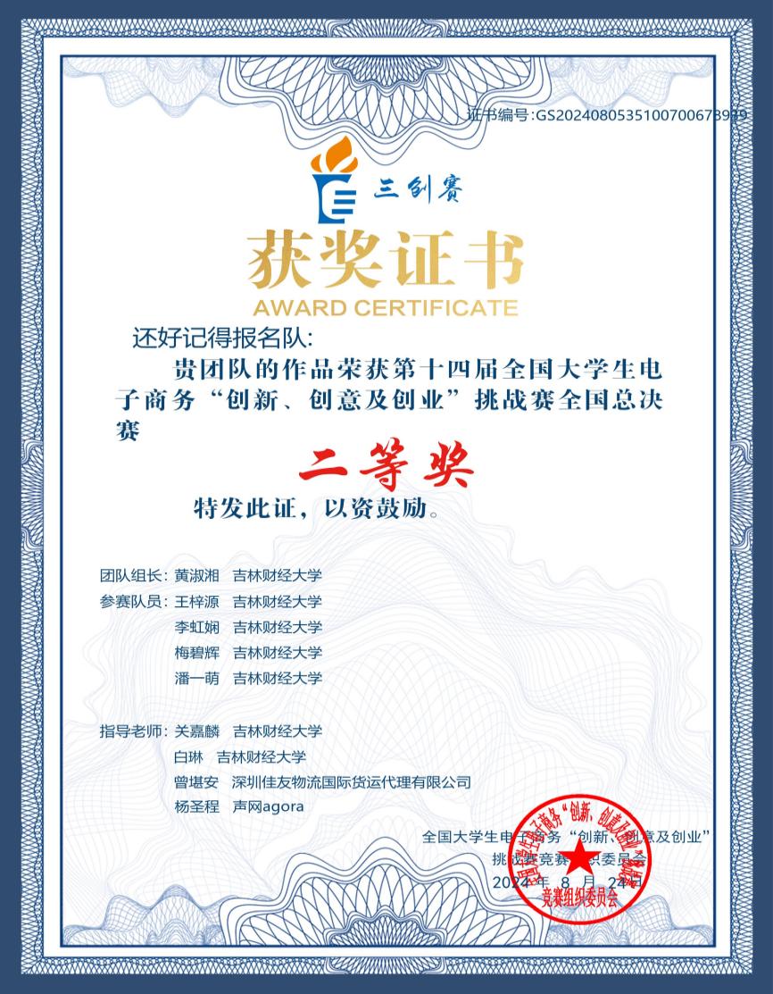 在常规赛全国总决赛中,由kaiyun官网国际经济贸易学院关嘉麟教授、白琳老师指导,经济学院黄淑湘和、潘一萌,国际经济贸易学院李虹娴、国际交流学院梅碧辉、会计学院王梓源组成的团队,凭借《百可e 商通——跨境贸易智慧枢纽和梦想的引擎驱动者》项目荣获实战赛全国总决赛二等奖。项目立足长吉图战略,致力于东北振兴和东北亚合作,促进跨境电商人才成长、产业转型和经济增长。